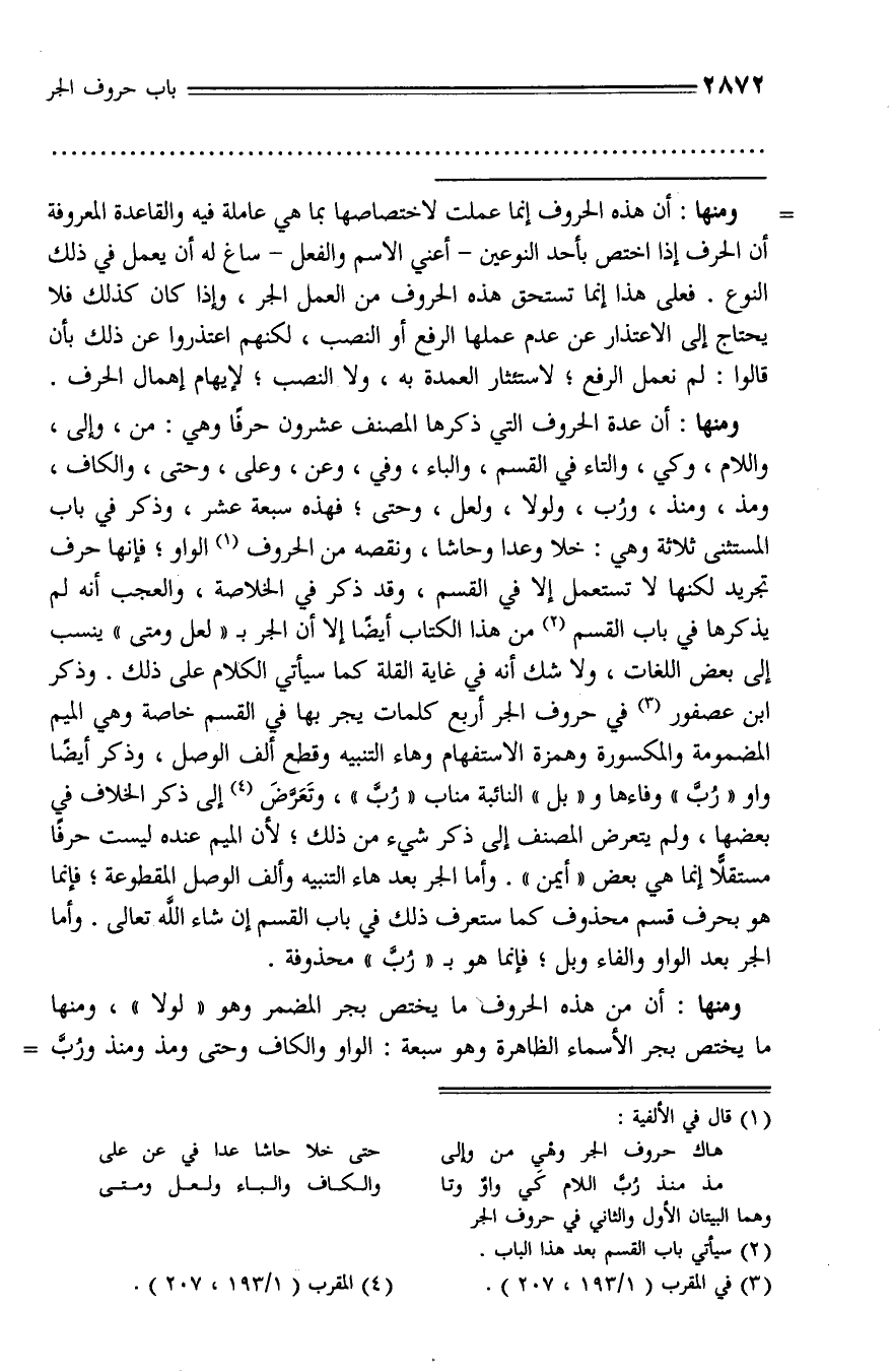ومنها: أن من هذه الحروف ما يختص بجر المضمر وهو «لولا»، ومنها ما يختص بجر الأسماء الظاهرة وهو سبعة: الواو والكاف وحتى ومذ ومنذ وربّ -