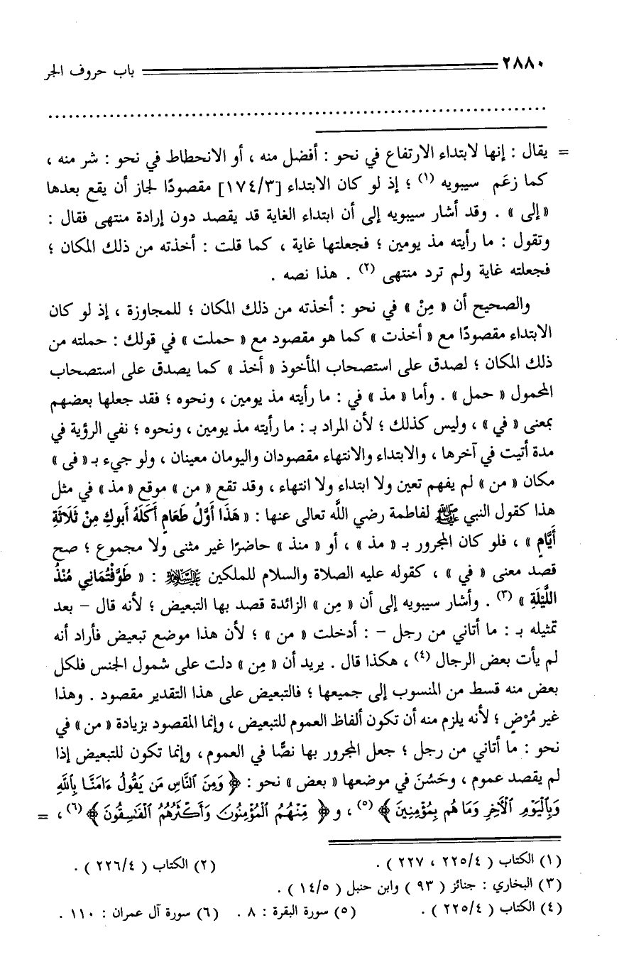 والصحيح أن «من» في نحو: أخذته من ذلك المكان؛ للمجاوزة، إذ لو كان الابتداء مقصودا مع «أخذت» كما هو مقصود مع «حملت» في قولك: حملته من ذلك المكان؛ لصدق على استصحاب المأخوذ «أخذ» كما يصدق على استصحاب المحمول «حمل». وأما «مذ» في: ما رأيته مذ يومين، ونحوه؛ فقد جعلها بعضهم بمعنى «في»، وليس كذلك؛ لأن المراد بـ: ما رأيته مذ يومين، ونحوه؛ نفي الرؤية في مدة أتيت في آخرها، والابتداء والانتهاء مقصودان واليومان معينان، ولو جيء بـ «فى» مكان «من» لم يفهم تعين ولا ابتداء ولا انتهاء، وقد تقع «من» موقع «مذ» في مثل هذا كقول النبي صلّى الله عليه وسلّم لفاطمة رضي الله تعالى عنها: «هذا أوّل طعام أكله أبوك من ثلاثة أيّام»، فلو كان المجرور بـ «مذ»، أو «منذ» حاضرا غير مثنى ولا مجموع؛ صح قصد معنى «في»، كقوله عليه الصلاة والسّلام للملكين عليهما السّلام: «طوّفتماني منذ اللّيلة» (¬3). وأشار سيبويه إلى أن «من» الزائدة قصد بها التبعيض؛ لأنه قال - بعد تمثيله بـ: ما أتاني من رجل -: أدخلت «من»؛ لأن هذا موضع تبعيض فأراد أنه لم يأت بعض الرجال (¬4)، هكذا قال. يريد أن «من» دلت على شمول الجنس فلكل بعض منه قسط من المنسوب إلى جميعها؛ فالتبعيض على هذا التقدير مقصود. وهذا غير مرض؛ لأنه يلزم منه أن تكون ألفاظ العموم للتبعيض، وإنما المقصود بزيادة «من»