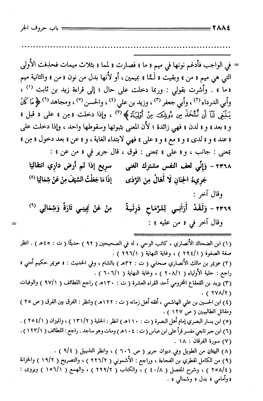 في الواجب فأدغم نونها في ميم «ما» فصارت «لمما» بثلاث ميمات فحذفت الأولى التي هي ميم «من» وبقيت «لمّا» بميمين، أو لأنها بدل من نون «من» والثانية ميم «ما». وأشرت بقولي: وربما دخلت على حال؛ إلى قراءة زيد بن ثابت (¬1)، وأبي الدرداء (¬2)، وأبي جعفر (¬3)، وزيد بن علي (¬4)، والحسن (¬5)، ومجاهد (¬6) ما كانَ يَنْبَغِي لَنا أَنْ نَتَّخِذَ مِنْ دُونِكَ مِنْ أَوْلِياءَ (¬7)، وإذا دخلت «من» على «قبل» و «بعد» و «لدن» فهي زائدة؛ لأن المعنى بثبوتها وسقوطها واحد، وإذا دخلت على «عند» و «لدى» و «مع» و «على» فهي لابتداء الغاية، و «عن» بعد دخول «من» بمعنى: جانب، و «على» بمعنى: فوق، قال جرير في «من عن»: