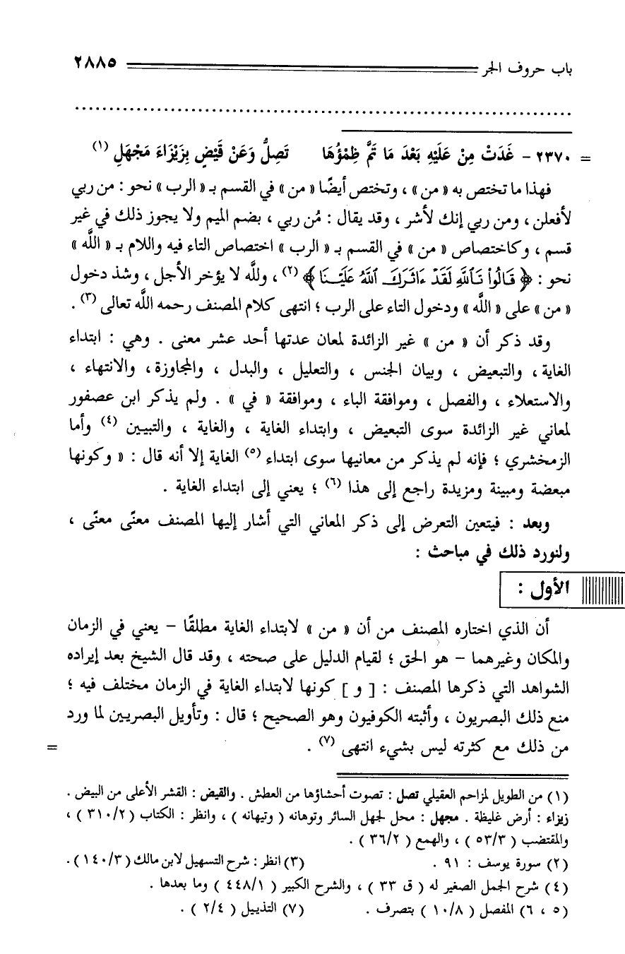 أن الذي اختاره المصنف من أن «من» لابتداء الغاية مطلقا - يعني في الزمان والمكان وغيرهما - هو الحق؛ لقيام الدليل على صحته، وقد قال الشيخ بعد إيراده الشواهد التي ذكرها المصنف: [و] كونها لابتداء الغاية في الزمان مختلف فيه؛ منع ذلك البصريون، وأثبته الكوفيون وهو الصحيح؛ قال: وتأويل البصريين لما ورد من ذلك مع كثرته ليس بشيء انتهى (¬7). -