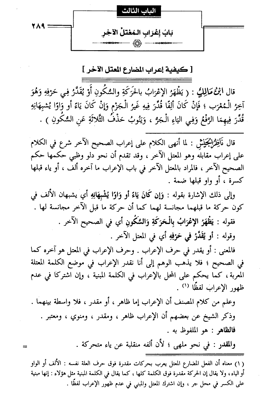 (¬1) معناه أن الفعل المضارع المعتل يعرب بحركات مقدرة فوق حرف العلة نفسه: الألف أو الواو أو الياء، ولا يقال إن الحركة مقدرة فوق الكلمة كلها، كما يقال في الكلمة المبنية مثل هؤلاء: إنها مبنية على الكسر في محل جر، وإن اشترك المعتل والمبني في عدم ظهور الإعراب لفظا.