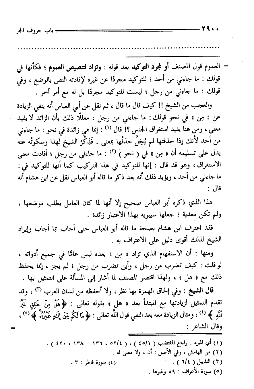 والعجب من الشيخ!! كيف قال ما قال، ثم نقل عن أبي العباس أنه ينفي الزيادة عن «من» في نحو قولك: ما جاءني من رجل، معللا ذلك بأن الزائد لا يفيد معنى، ومن هنا يفيد استغراق الجنس؟! قال (¬1): إنما هي زائدة في نحو: ما جاءني من أحد لأنك إذا حذفتها لم يخلّ حذفها بمعنى. فذكر الشيخ لهذا وسكوته عنه يدل على تسليمه أن «من» في