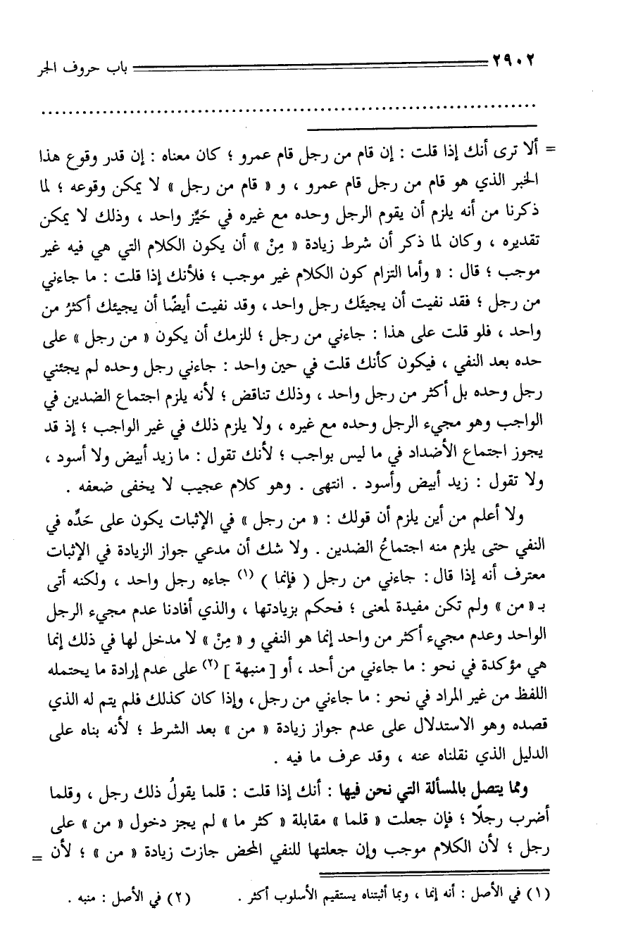 التزام كون الكلام غير موجب؛ فلأنك إذا قلت: ما جاءني من رجل؛ فقد نفيت أن يجيئك رجل واحد، وقد نفيت أيضا أن يجيئك أكثر من واحد، فلو قلت على هذا: جاءني من رجل؛ للزمك أن يكون «من رجل» على حده بعد النفي، فيكون كأنك قلت في حين واحد: جاءني رجل وحده لم يجئني رجل وحده بل أكثر من رجل واحد، وذلك تناقض؛ لأنه يلزم اجتماع الضدين في الواجب وهو مجيء الرجل وحده مع غيره، ولا يلزم ذلك في غير الواجب؛ إذ قد يجوز اجتماع الأضداد في ما ليس بواجب؛ لأنك تقول: ما زيد أبيض ولا أسود، ولا تقول: زيد أبيض وأسود. انتهى. وهو كلام عجيب لا يخفى ضعفه.