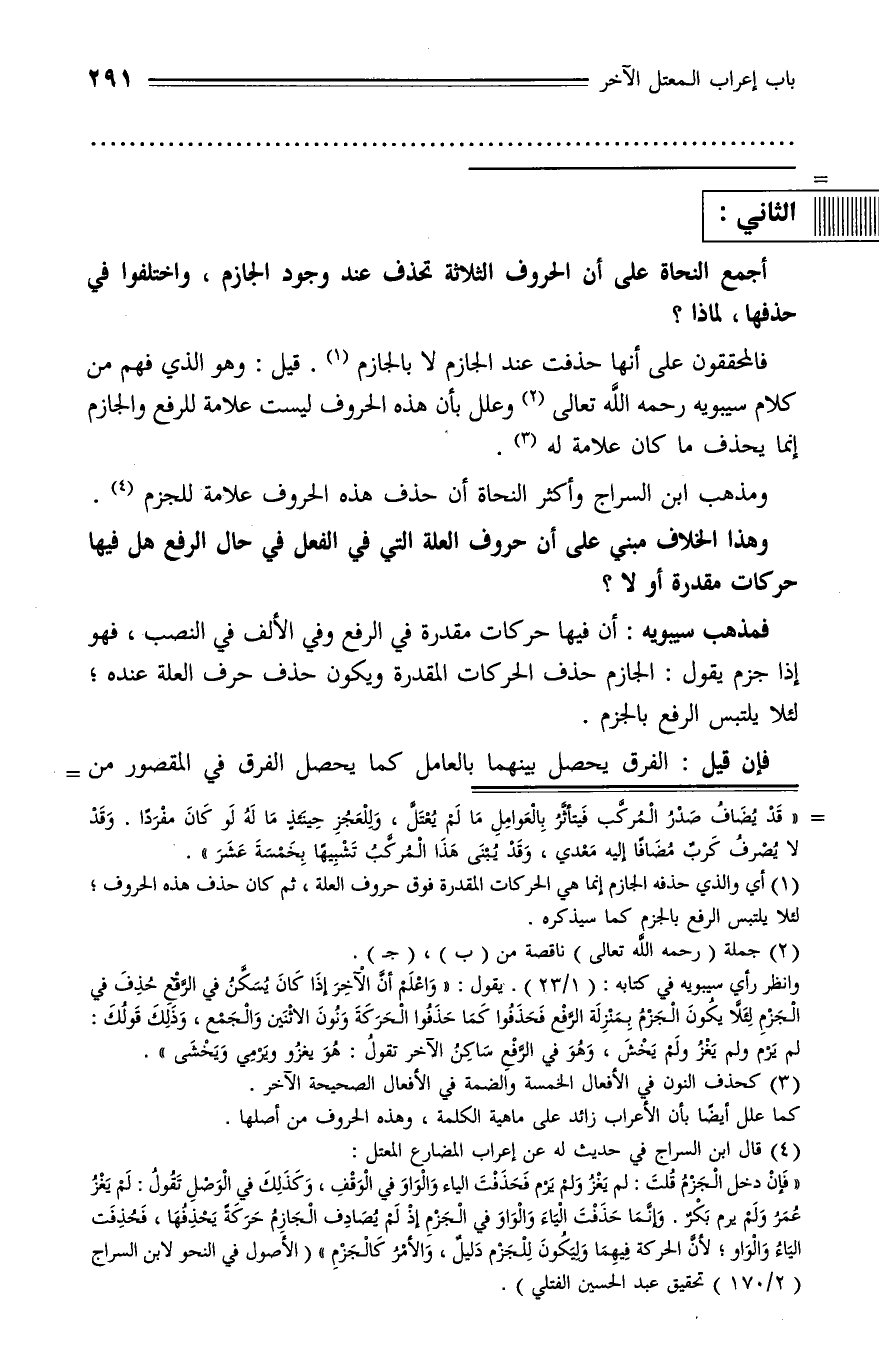 وانظر رأي سيبويه في كتابه: (1/ 23). يقول: «واعلم أنّ الآخر إذا كان يسكّن في الرّفع حذف في الجزم لئلّا يكون الجزم بمنزلة الرّفع فحذفوا كما حذفوا الحركة ونون الاثنين والجمع، وذلك قولك: