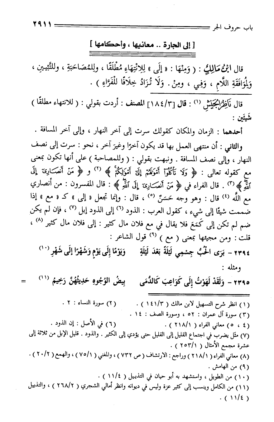 والثاني: أن منتهى العمل بها قد يكون آخرا وغير آخر، نحو: سرت إلى نصف النهار، وإلى نصف المسافة. ونبهت بقولي: (وللمصاحبة) على أنها تكون بمعنى مع كقوله تعالى: وَلا تَأْكُلُوا أَمْوالَهُمْ إِلى أَمْوالِكُمْ (¬2) ومَنْ أَنْصارِي إِلَى اللَّهِ * (¬3). قال الفراء في مَنْ أَنْصارِي إِلَى اللَّهِ: * قال المفسرون: من أنصاري مع الله (¬4) قال: وهو وجه حسن (¬5)، قال: وإنما تجعل «إلى» كـ «مع» إذا ضممت شيئا إلى شيء، كقول العرب: الذود (¬6) إلى الذود إبل (¬7)، فإن لم يكن ضم لم تكن إلى كمع فلا يقال في مع فلان مال كثير: إلى فلان مال كثير (¬8)، قلت: ومن مجيئها بمعنى (مع) (¬9) قول الشاعر: