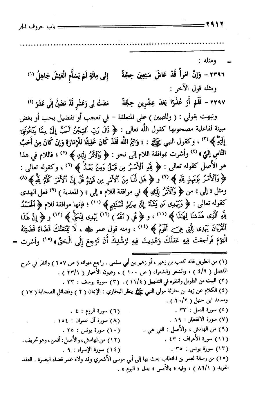 وَالْأَمْرُ يَوْمَئِذٍ لِلَّهِ (¬7) وهَلْ لَنا مِنَ الْأَمْرِ مِنْ شَيْءٍ قُلْ إِنَّ الْأَمْرَ كُلَّهُ لِلَّهِ (¬8) ومثل «إلى» من وَالْأَمْرُ إِلَيْكِ في موافقة اللام «إلى» (المعدية) (¬9) فعل الهدى كقوله تعالى: وَيَهْدِي مَنْ يَشاءُ إِلى صِراطٍ مُسْتَقِيمٍ (¬10)؛ فإنها موافقة للام الْحَمْدُ لِلَّهِ الَّذِي هَدانا لِهذا (¬11)، وقُلِ (اللَّهُ) (¬12) يَهْدِي لِلْحَقِّ (¬13) وإِنَّ هذَا الْقُرْآنَ يَهْدِي لِلَّتِي هِيَ أَقْوَمُ (¬14)، ومنه قول عمر رضي الله عنه، لا يمنعنّك قضاء قضيته اليوم فراجعت فيه عقلك وهديت فيه لرشدك أن ترجع إلى الحقّ» (¬15) وأشرت -