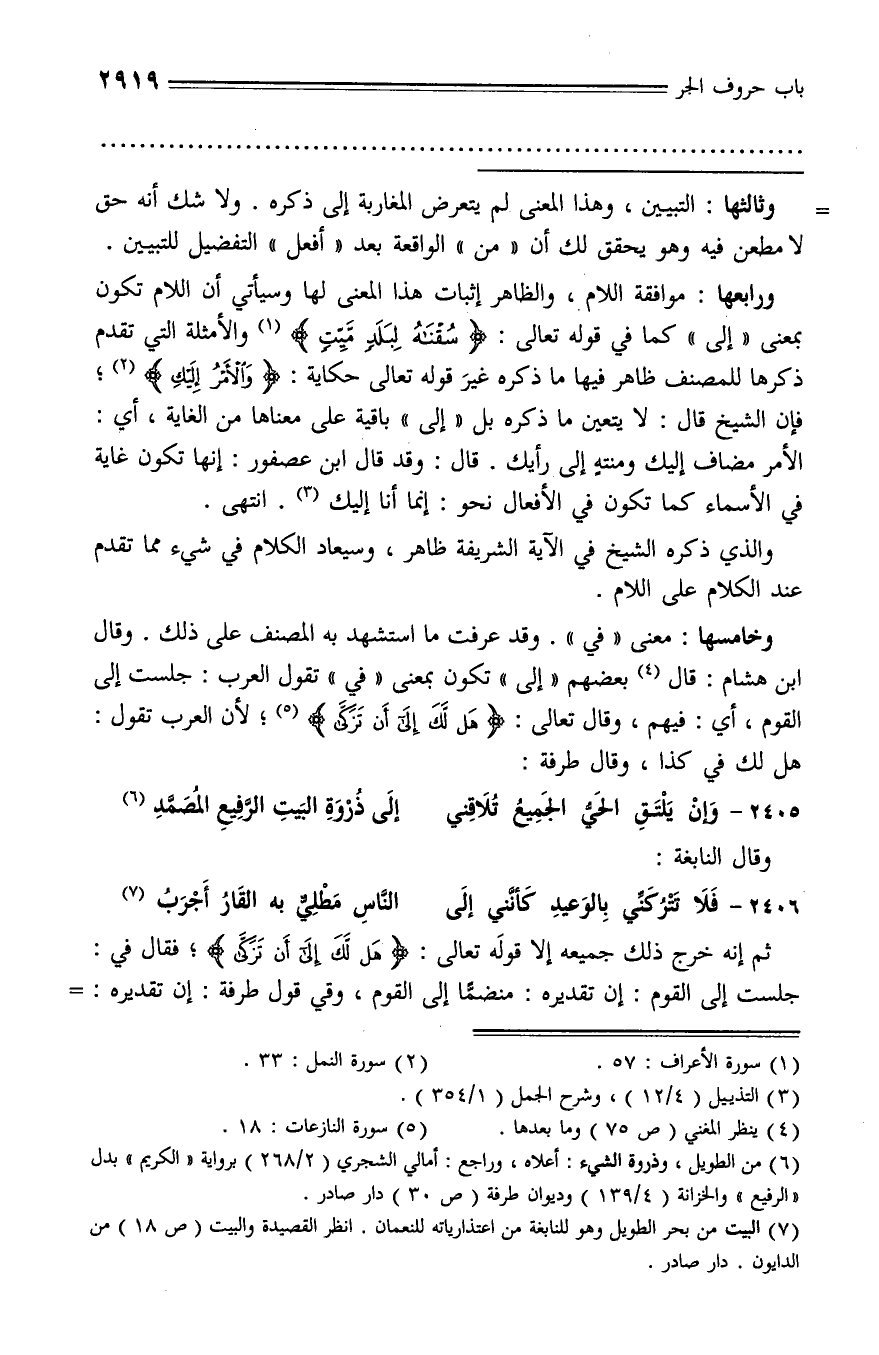 ورابعها: موافقة اللام، والظاهر إثبات هذا المعنى لها وسيأتي أن اللام تكون بمعنى «إلى» كما في قوله تعالى: سُقْناهُ لِبَلَدٍ مَيِّتٍ (¬1) والأمثلة التي تقدم ذكرها للمصنف ظاهر فيها ما ذكره غير قوله تعالى حكاية: وَالْأَمْرُ إِلَيْكِ (¬2)؛ فإن الشيخ قال: لا يتعين ما ذكره بل «إلى» باقية على معناها من الغاية، أي: