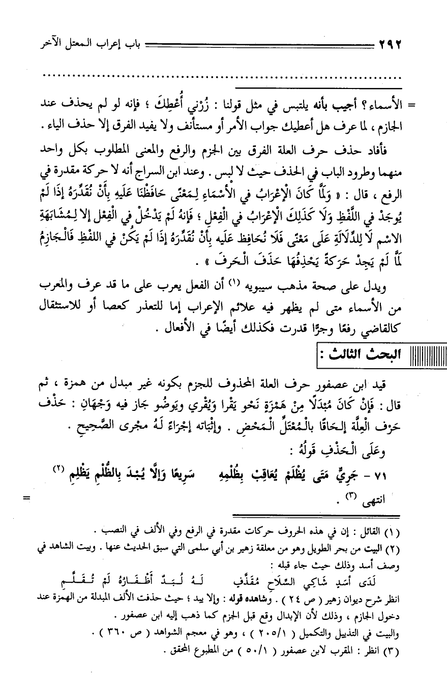 انظر شرح ديوان زهير (ص 24). وشاهده قوله: وإلا يبد؛ حيث حذفت الألف المبدلة من الهمزة عند دخول الجازم، وذلك لأن الإبدال وقع قبل الجزم كما ذهب إليه ابن عصفور.