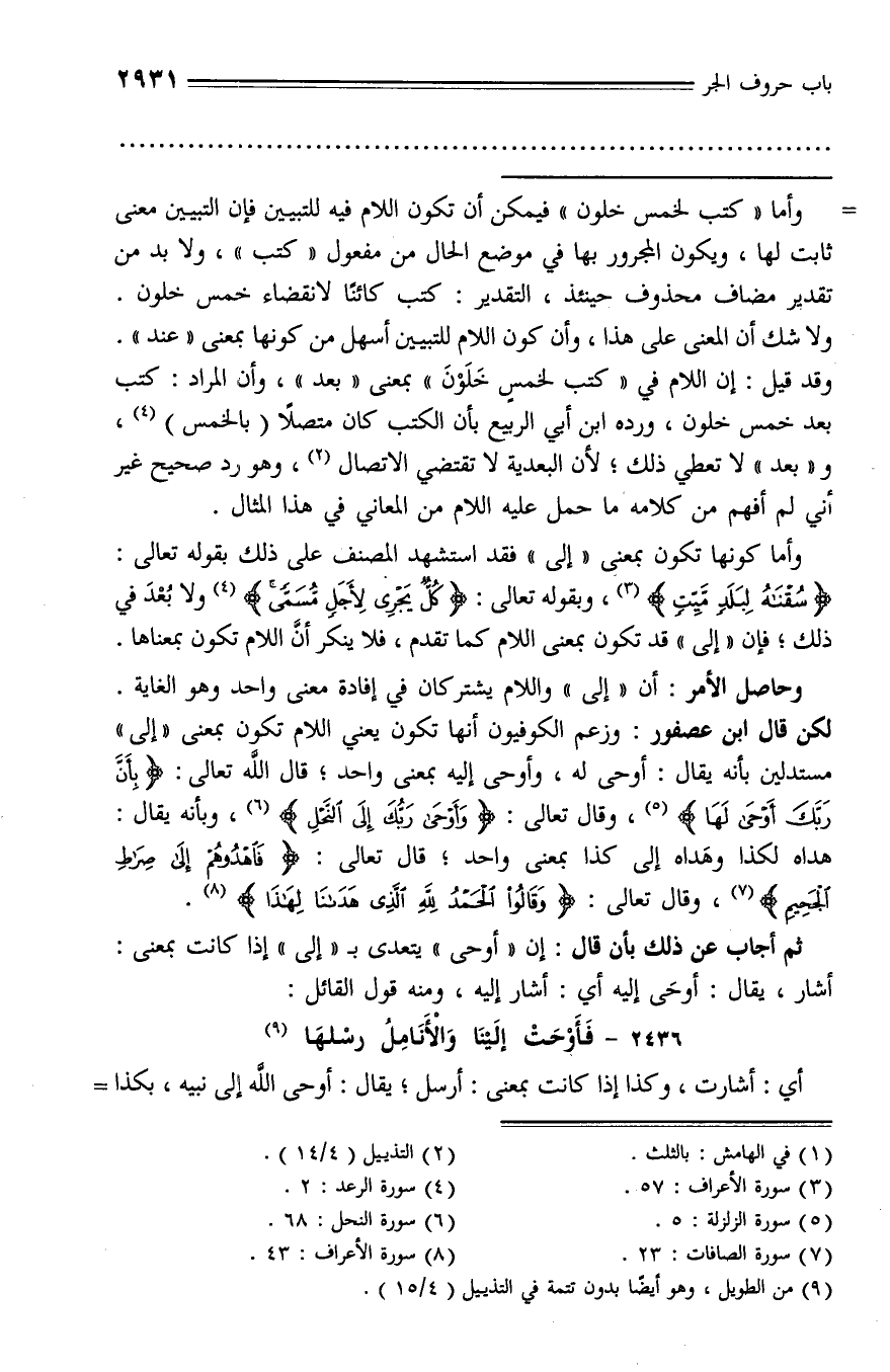 لكن قال ابن عصفور: وزعم الكوفيون أنها تكون يعني اللام تكون بمعنى «إلى» مستدلين بأنه يقال: أوحى له، وأوحى إليه بمعنى واحد؛ قال الله تعالى: بِأَنَّ رَبَّكَ أَوْحى لَها (¬5)، وقال تعالى: وَأَوْحى رَبُّكَ إِلَى النَّحْلِ (¬6)، وبأنه يقال: