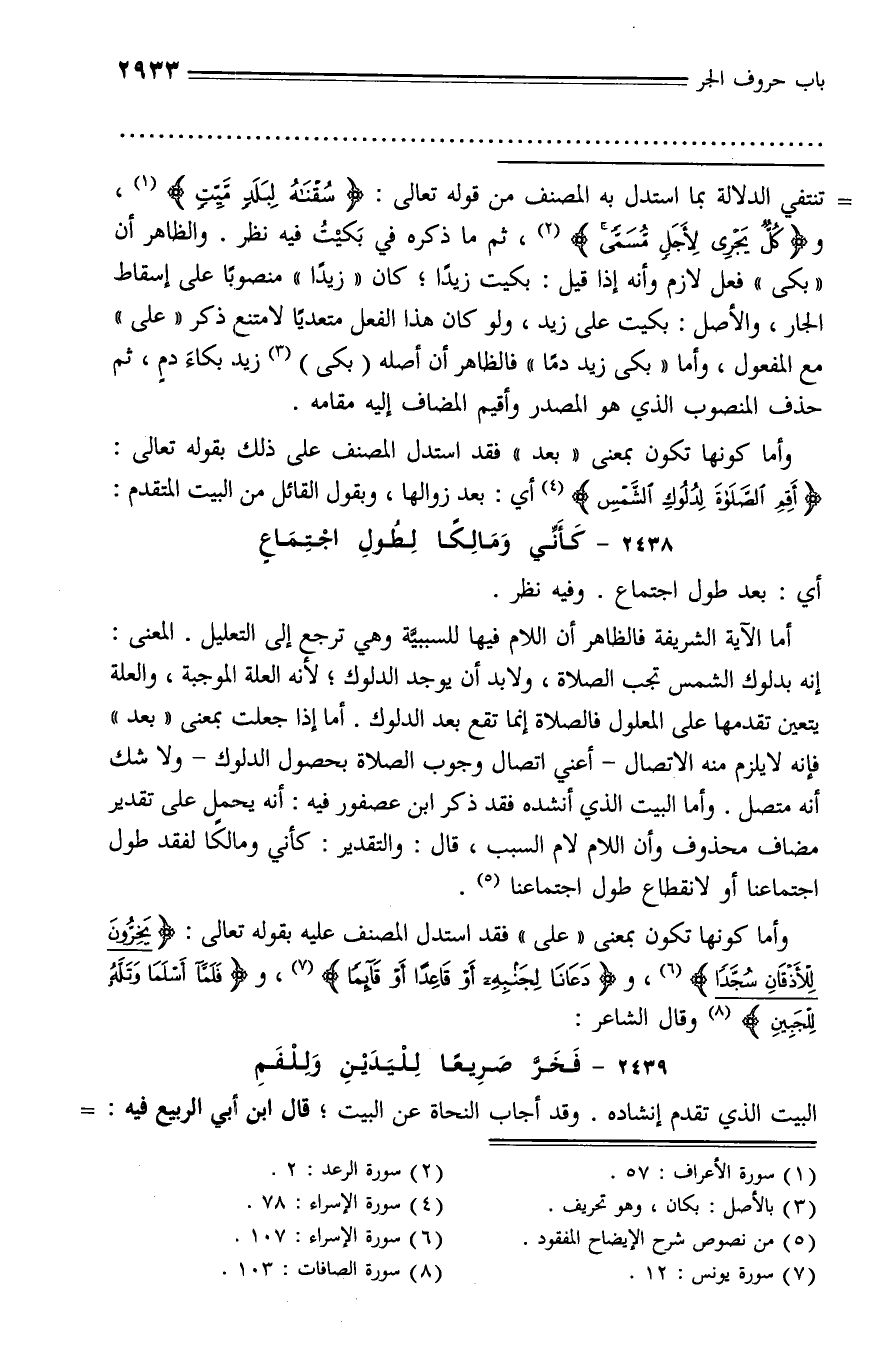 إنه بدلوك الشمس تجب الصلاة، ولا بد أن يوجد الدلوك؛ لأنه العلة الموجبة، والعلة يتعين تقدمها على المعلول فالصلاة إنما تقع بعد الدلوك. أما إذا جعلت بمعنى «بعد» فإنه لا يلزم منه الاتصال - أعني اتصال وجوب الصلاة بحصول الدلوك - ولا شك أنه متصل. وأما البيت الذي أنشده فقد ذكر ابن عصفور فيه: أنه يحمل على تقدير مضاف محذوف وأن اللام لام السبب، قال: والتقدير: كأني ومالكا لفقد طول اجتماعنا أو لانقطاع طول اجتماعنا (¬5).