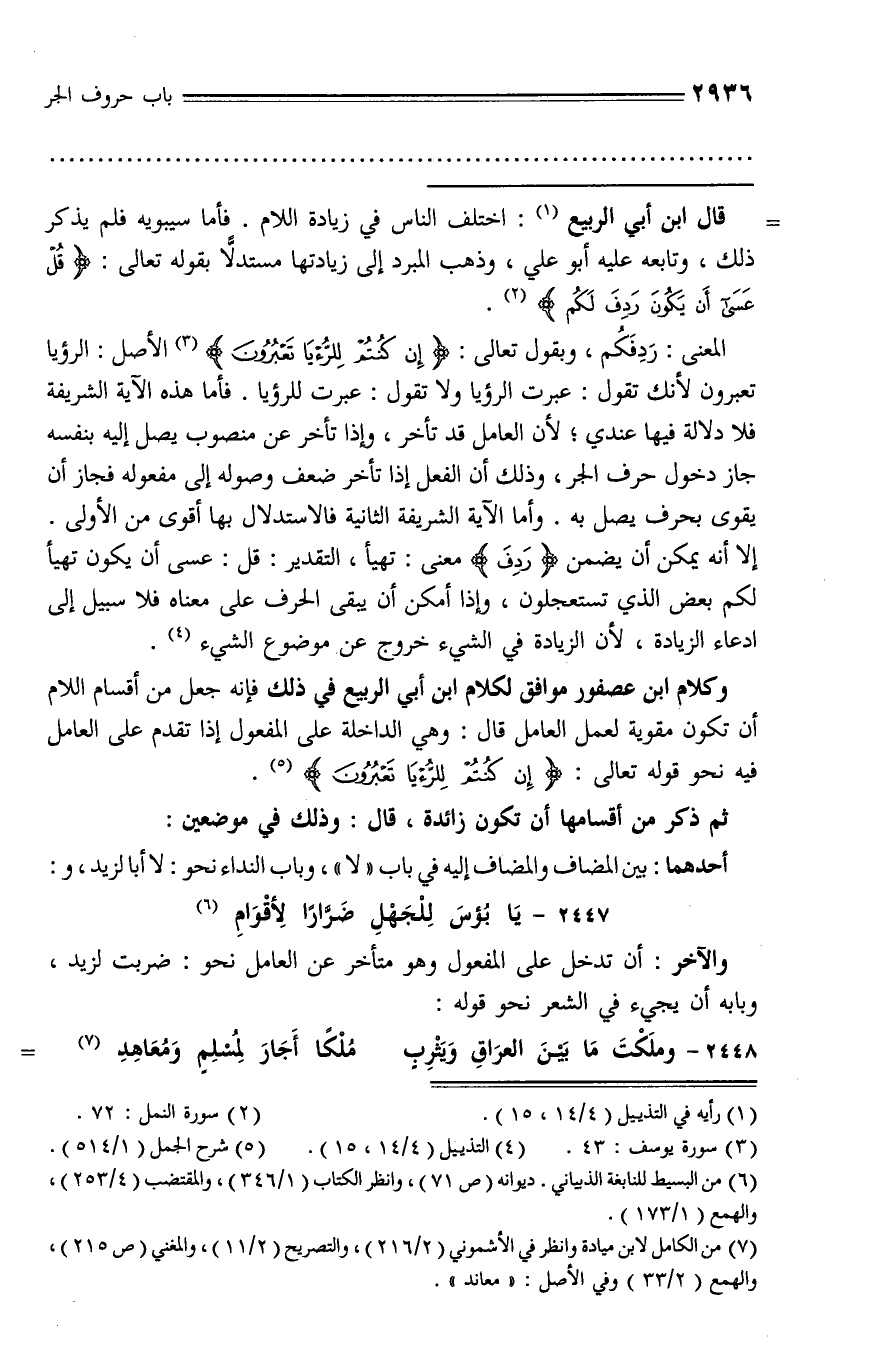 وكلام ابن عصفور موافق لكلام ابن أبي الربيع في ذلك فإنه جعل من أقسام اللام أن تكون مقوية لعمل العامل قال: وهي الداخلة على المفعول إذا تقدم على العامل فيه نحو قوله تعالى: إِنْ كُنْتُمْ لِلرُّءْيا تَعْبُرُونَ (¬5).