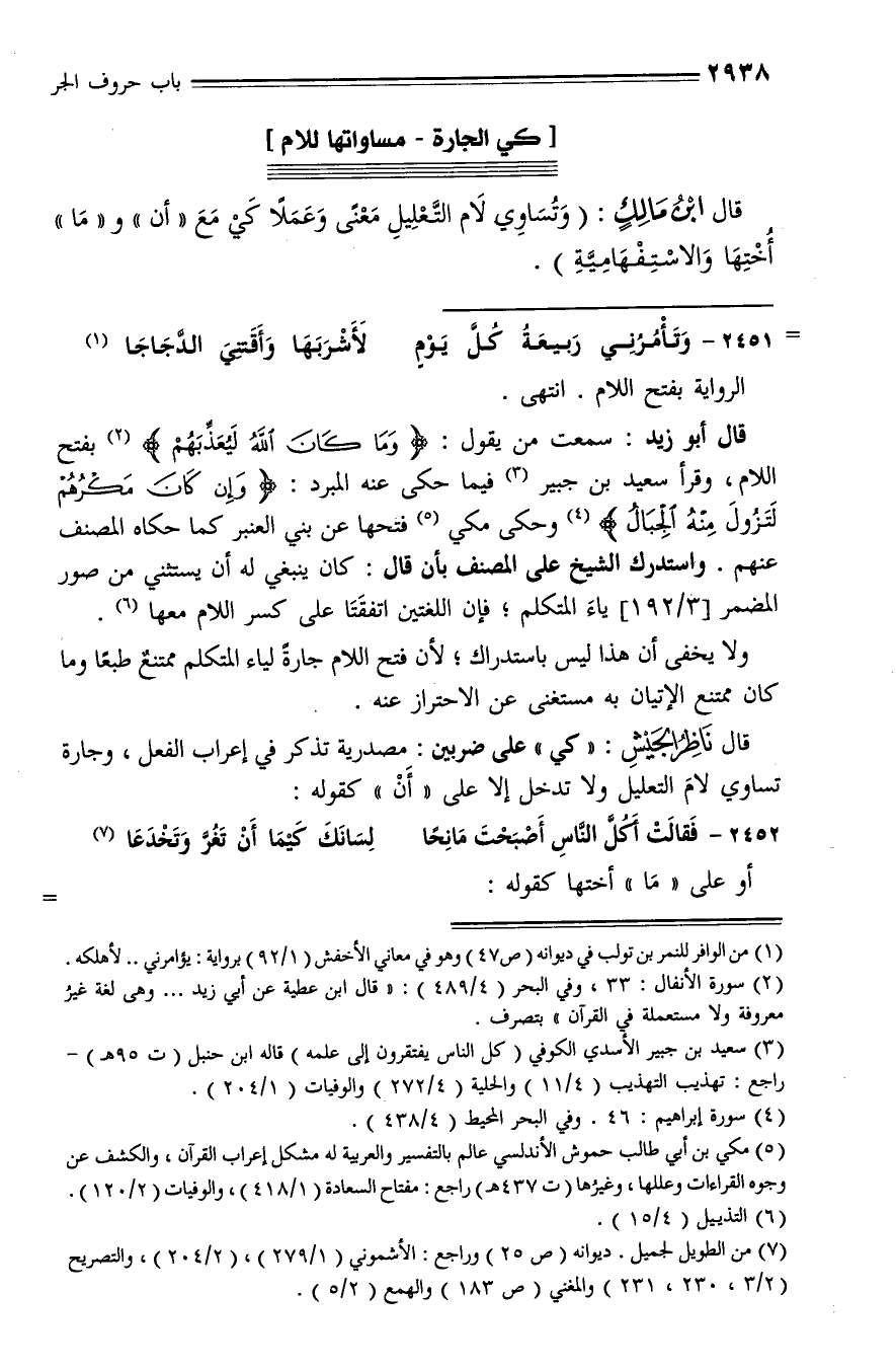 قال ناظر الجيش: «كي» على ضربين: مصدرية تذكر في إعراب الفعل، وجارة تساوي لام التعليل ولا تدخل إلا على «أن» كقوله: