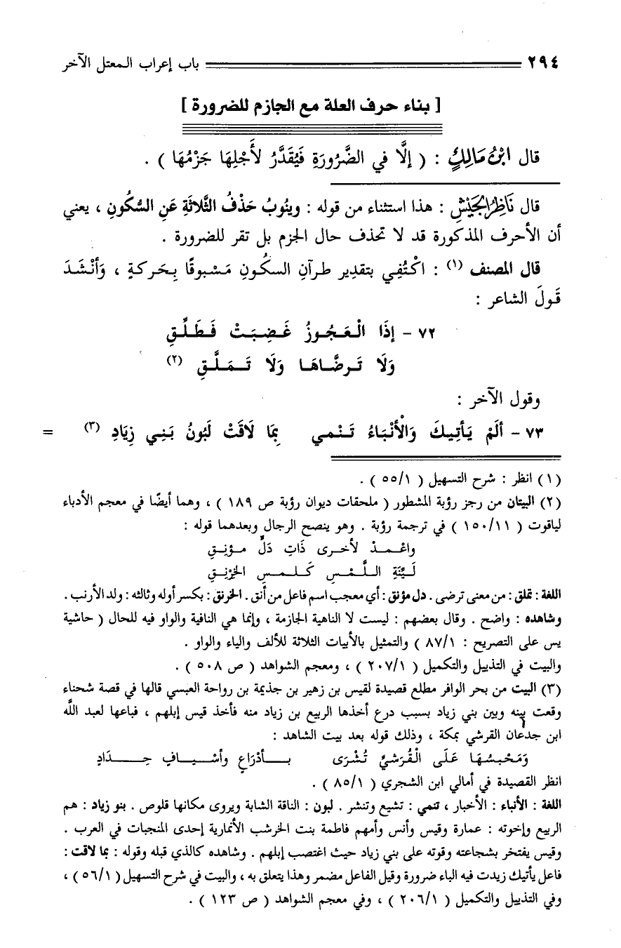 وشاهده: واضح. وقال بعضهم: ليست لا الناهية الجازمة، وإنما هي النافية والواو فيه للحال (حاشية يس على التصريح: 1/ 87) والتمثيل بالأبيات الثلاثة للألف والياء والواو.