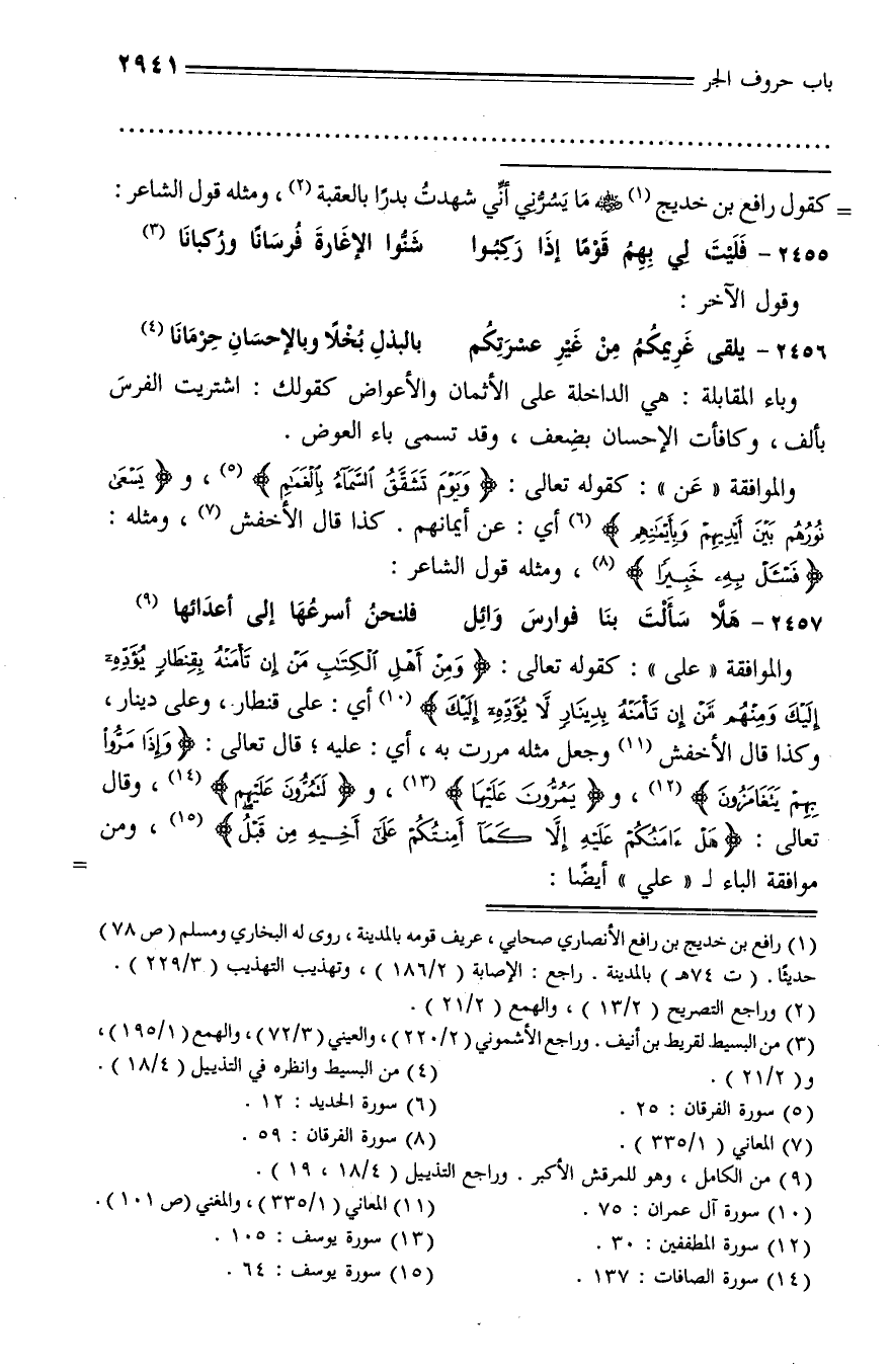 والموافقة «على»: كقوله تعالى: وَمِنْ أَهْلِ الْكِتابِ مَنْ إِنْ تَأْمَنْهُ بِقِنْطارٍ يُؤَدِّهِ إِلَيْكَ وَمِنْهُمْ مَنْ إِنْ تَأْمَنْهُ بِدِينارٍ لا يُؤَدِّهِ إِلَيْكَ (¬10) أي: على قنطار، وعلى دينار، وكذا قال الأخفش (¬11) وجعل مثله مررت به، أي: عليه؛ قال تعالى: وَإِذا مَرُّوا بِهِمْ يَتَغامَزُونَ (¬12)، ويَمُرُّونَ عَلَيْها (¬13)، ولَتَمُرُّونَ عَلَيْهِمْ (¬14)، وقال تعالى: هَلْ آمَنُكُمْ عَلَيْهِ إِلَّا كَما أَمِنْتُكُمْ عَلى أَخِيهِ مِنْ قَبْلُ (¬15)، ومن موافقة الباء لـ «علي» أيضا: -