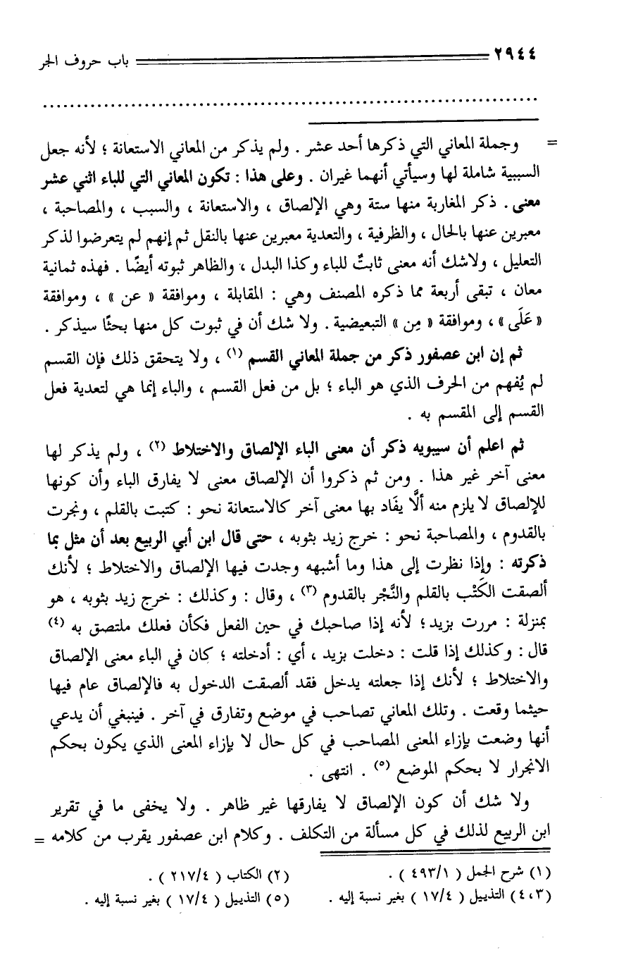 ثم اعلم أن سيبويه ذكر أن معنى الباء الإلصاق والاختلاط (¬2)، ولم يذكر لها معنى آخر غير هذا. ومن ثم ذكروا أن الإلصاق معنى لا يفارق الباء وأن كونها للإلصاق لا يلزم منه ألّا يفاد بها معنى آخر كالاستعانة نحو: كتبت بالقلم، ونجرت بالقدوم، والمصاحبة نحو: خرج زيد بثوبه، حتى قال ابن أبي الربيع بعد أن مثل بما ذكرته: وإذا نظرت إلى هذا وما أشبهه وجدت فيها الإلصاق والاختلاط؛ لأنك ألصقت الكتب بالقلم والنّجر بالقدوم (¬3)، وقال: وكذلك: خرج زيد بثوبه، هو بمنزلة: مررت بزيد؛ لأنه إذا صاحبك في حين الفعل فكأن فعلك ملتصق به (¬4) قال: وكذلك إذا قلت: دخلت بزيد، أي: أدخلته؛ كان في الباء معنى الإلصاق والاختلاط؛ لأنك إذا جعلته يدخل فقد ألصقت الدخول به فالإلصاق عام فيها حيثما وقعت. وتلك المعاني تصاحب في موضع وتفارق في آخر. فينبغي أن يدعي أنها وضعت بإزاء المعنى المصاحب في كل حال لا بإزاء المعنى الذي يكون بحكم الانجرار لا بحكم الموضع (¬5). انتهى.
