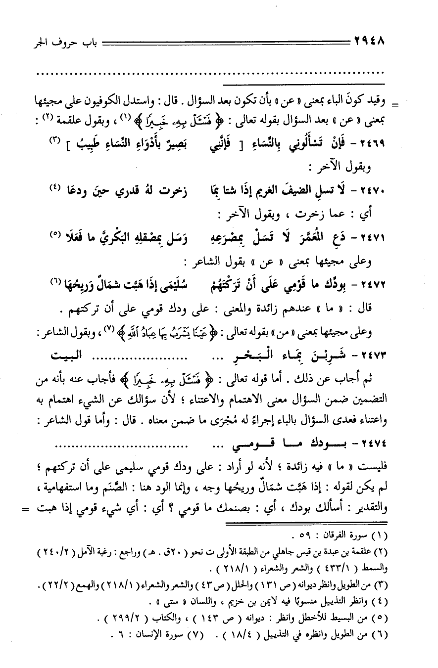 وقيد كون الباء بمعنى «عن» بأن تكون بعد السؤال. قال: واستدل الكوفيون على مجيئها بمعنى «عن» بعد السؤال بقوله تعالى: فَسْئَلْ بِهِ خَبِيراً (¬1)، وبقول علقمة (¬2):