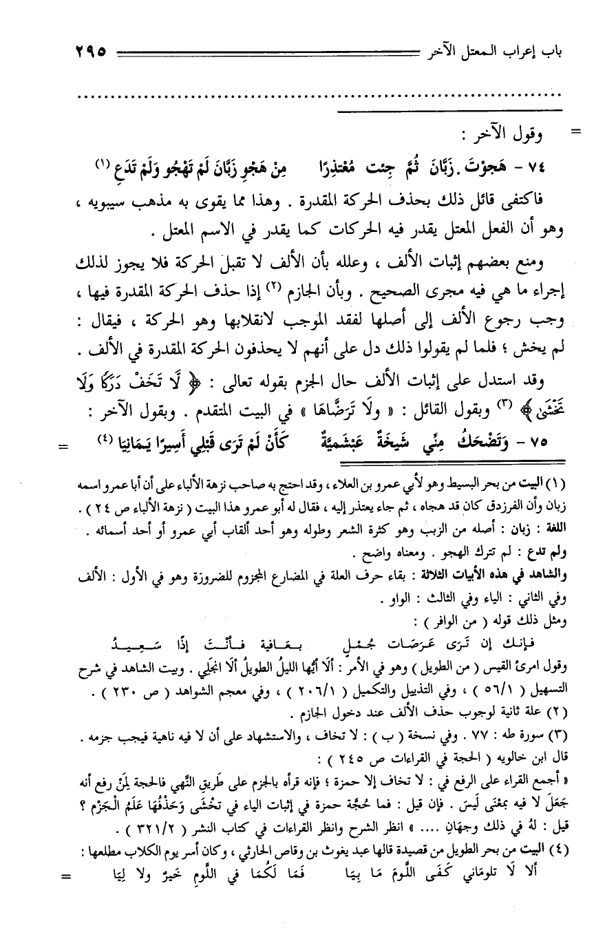فاكتفى قائل ذلك بحذف الحركة المقدرة. وهذا مما يقوى به مذهب سيبويه، وهو أن الفعل المعتل يقدر فيه الحركات كما يقدر في الاسم المعتل.