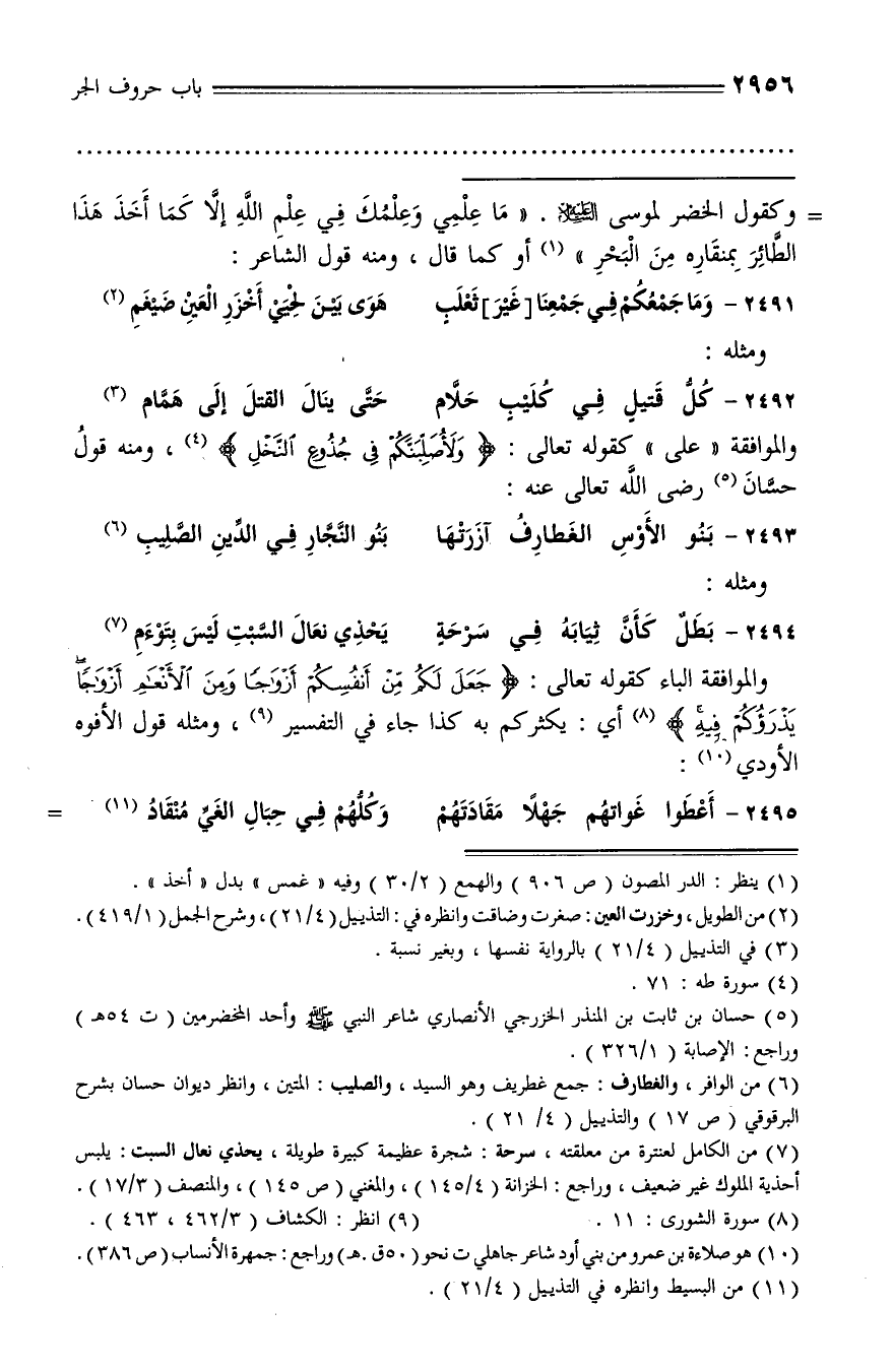 وكقول الخضر لموسى عليه السّلام. «ما علمي وعلمك في علم الله إلّا كما أخذ هذا الطّائر بمنقاره من البحر» (¬1) أو كما قال، ومنه قول الشاعر: