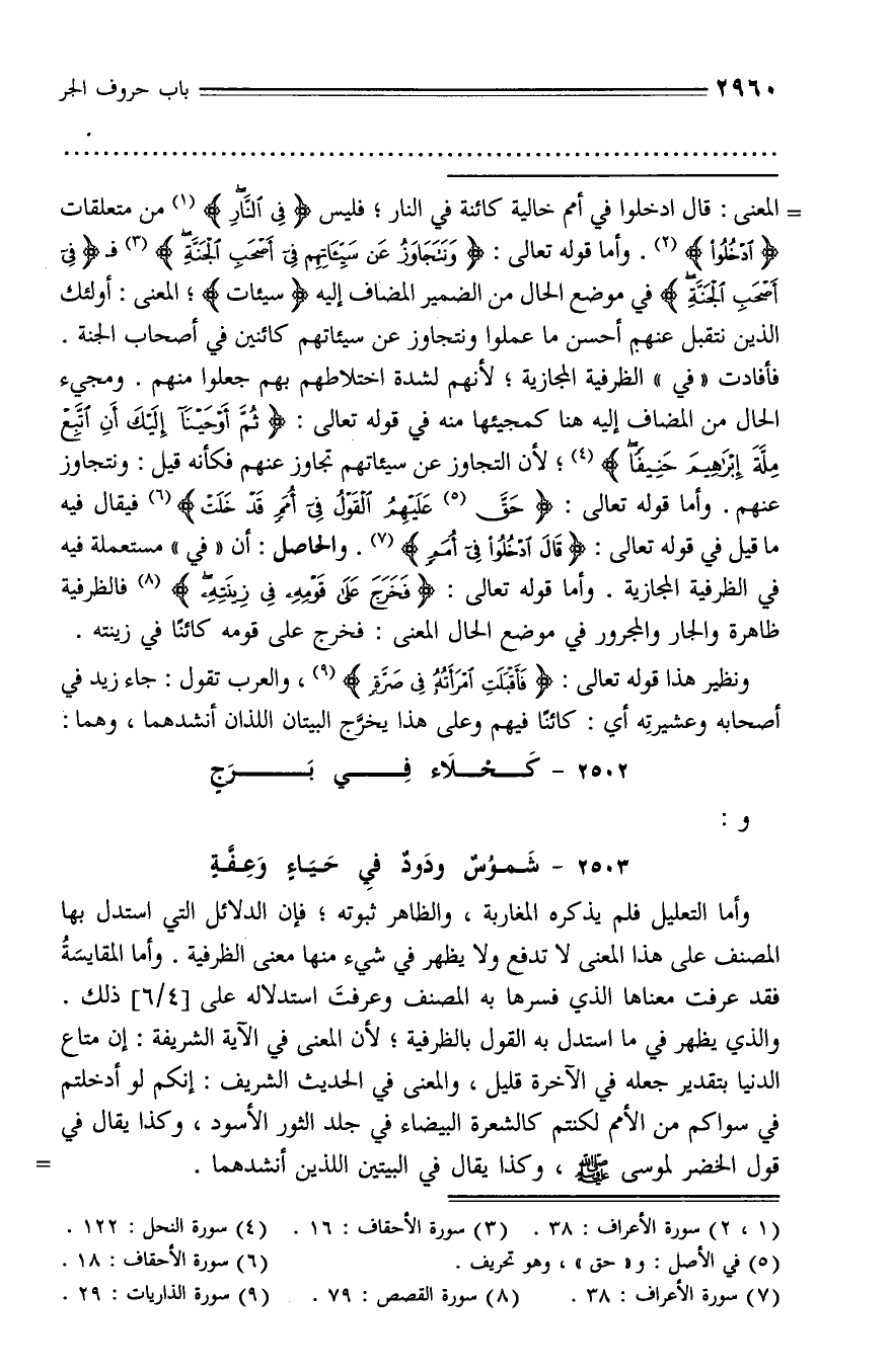 فأفادت «في» الظرفية المجازية؛ لأنهم لشدة اختلاطهم بهم جعلوا منهم. ومجيء الحال من المضاف إليه هنا كمجيئها منه في قوله تعالى: ثُمَّ أَوْحَيْنا إِلَيْكَ أَنِ اتَّبِعْ مِلَّةَ إِبْراهِيمَ حَنِيفاً (¬4)؛ لأن التجاوز عن سيئاتهم تجاوز عنهم فكأنه قيل: ونتجاوز عنهم. وأما قوله تعالى: حَقَّ (¬5) عَلَيْهِمُ الْقَوْلُ فِي أُمَمٍ قَدْ خَلَتْ (¬6) فيقال فيه ما قيل في قوله تعالى: قالَ ادْخُلُوا فِي أُمَمٍ (¬7). والحاصل: أن «في» مستعملة فيه في الظرفية المجازية. وأما قوله تعالى: فَخَرَجَ عَلى قَوْمِهِ فِي زِينَتِهِ (¬8) فالظرفية ظاهرة والجار والمجرور في موضع الحال المعنى: فخرج على قومه كائنا في زينته.