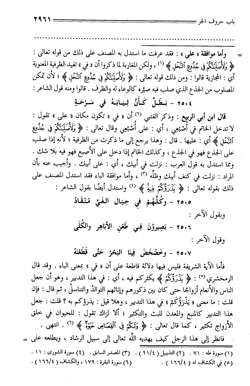وَلَأُصَلِّبَنَّكُمْ فِي جُذُوعِ النَّخْلِ (¬1)، ولكن المغاربة لما ذكروا أن «في» تفيد الظرفية المعنوية أي: المجازية قالوا: ومن ذلك قوله تعالى: وَلَأُصَلِّبَنَّكُمْ فِي جُذُوعِ النَّخْلِ؛ لأن تمكن المصلوب من الجذع الذي صلب فيه صيّره كالوعاء له والظرف. قالوا ومنه قول الشاعر: