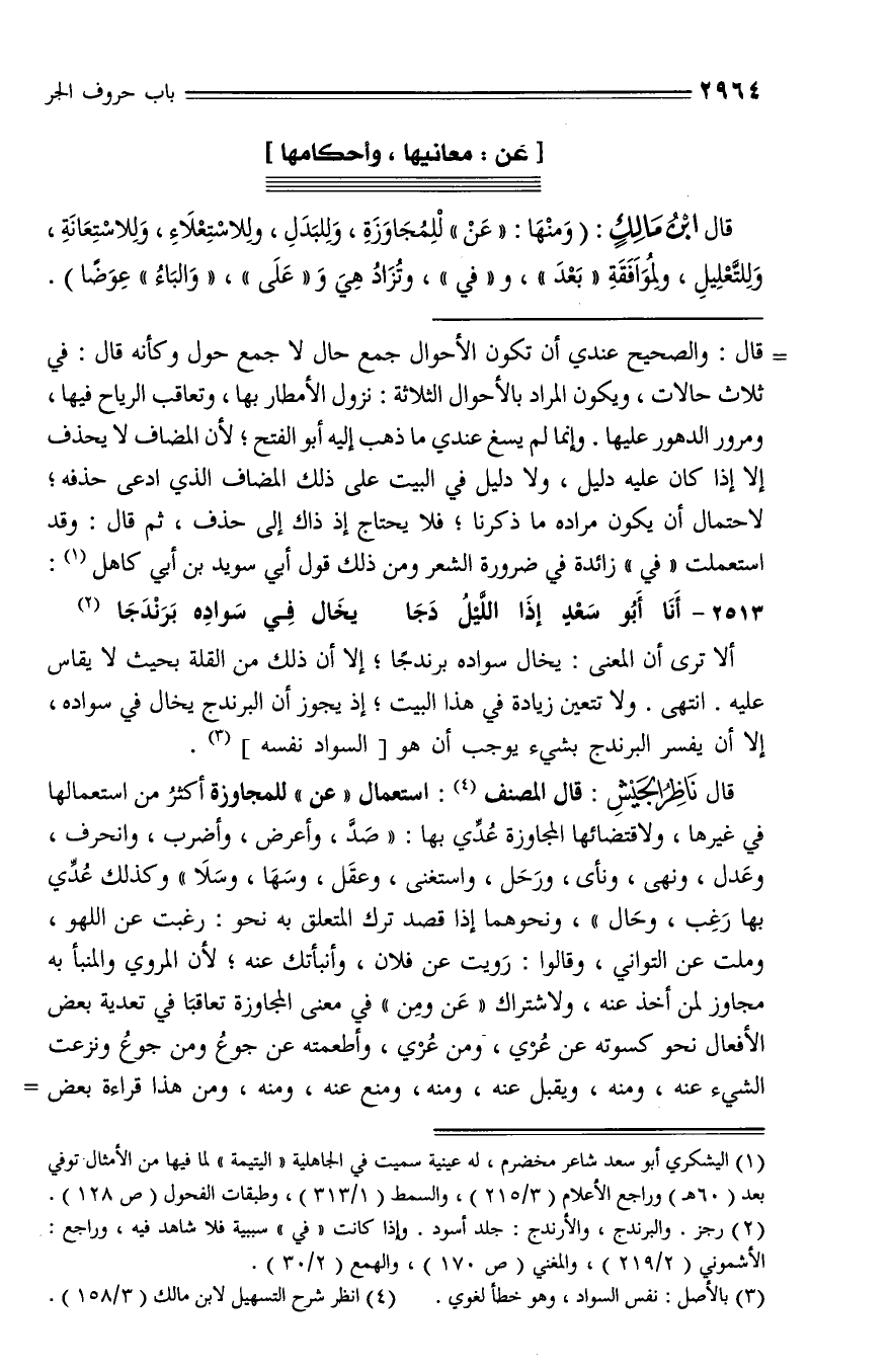 قال: والصحيح عندي أن تكون الأحوال جمع حال لا جمع حول وكأنه قال: في ثلاث حالات، ويكون المراد بالأحوال الثلاثة: نزول الأمطار بها، وتعاقب الرياح فيها، ومرور الدهور عليها. وإنما لم يسغ عندي ما ذهب إليه أبو الفتح؛ لأن المضاف لا يحذف إلا إذا كان عليه دليل، ولا دليل في البيت على ذلك المضاف الذي ادعى حذفه؛ لاحتمال أن يكون مراده ما ذكرنا؛ فلا يحتاج إذ ذاك إلى حذف، ثم قال: وقد استعملت «في» زائدة في ضرورة الشعر ومن ذلك قول أبي سويد بن أبي كاهل (¬1):