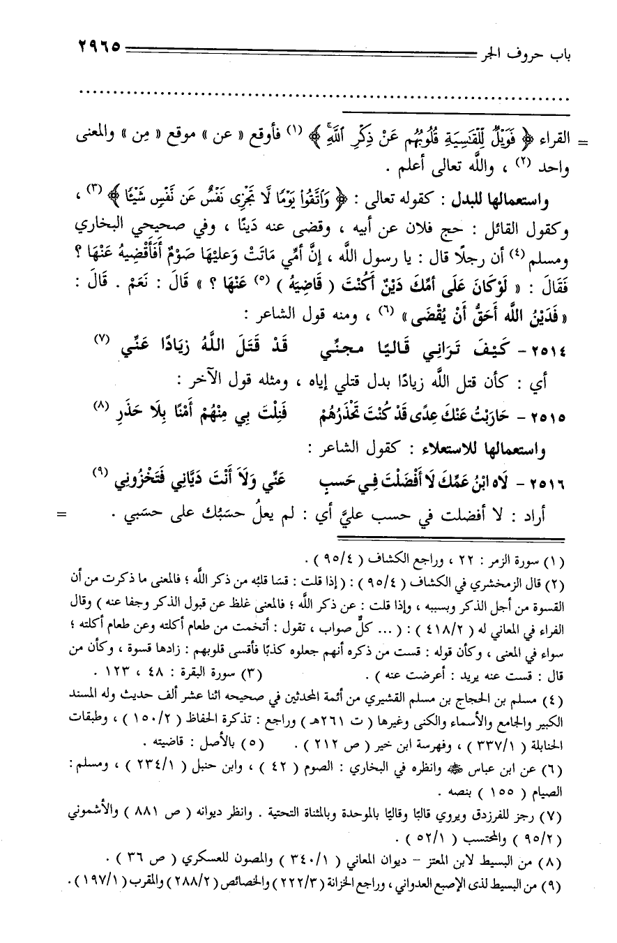 (¬2) قال الزمخشري في الكشاف (4/ 95): (إذا قلت: قسا قلبه من ذكر الله؛ فالمعنى ما ذكرت من أن القسوة من أجل الذكر وبسببه، وإذا قلت: عن ذكر الله؛ فالمعنى غلظ عن قبول الذكر وجفا عنه) وقال الفراء في المعاني له (2/ 418): (... كلّ صواب، تقول: أتخمت من طعام أكلته وعن طعام أكلته؛ سواء في المعنى، وكأن قوله: قست من ذكره أنهم جعلوه كذبا فأقسى قلوبهم: زادها قسوة، وكأن من قال: قست عنه يريد: أعرضت عنه).