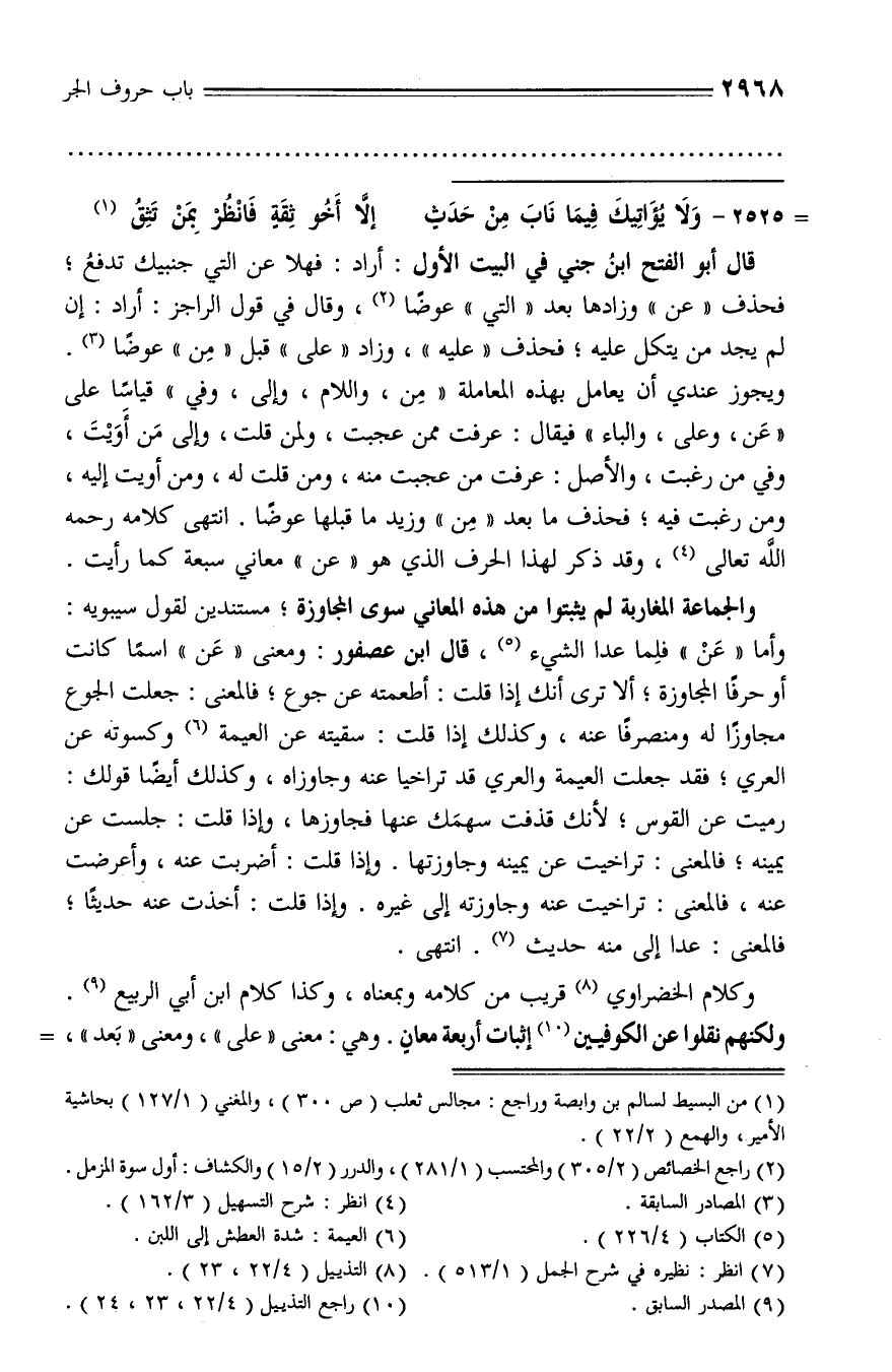 ويجوز عندي أن يعامل بهذه المعاملة «من، واللام، وإلى، وفي» قياسا على «عن، وعلى، والباء» فيقال: عرفت ممن عجبت، ولمن قلت، وإلى من أويت، وفي من رغبت، والأصل: عرفت من عجبت منه، ومن قلت له، ومن أويت إليه، ومن رغبت فيه؛ فحذف ما بعد «من» وزيد ما قبلها عوضا. انتهى كلامه رحمه الله تعالى (¬4)، وقد ذكر لهذا الحرف الذي هو «عن» معاني سبعة كما رأيت.