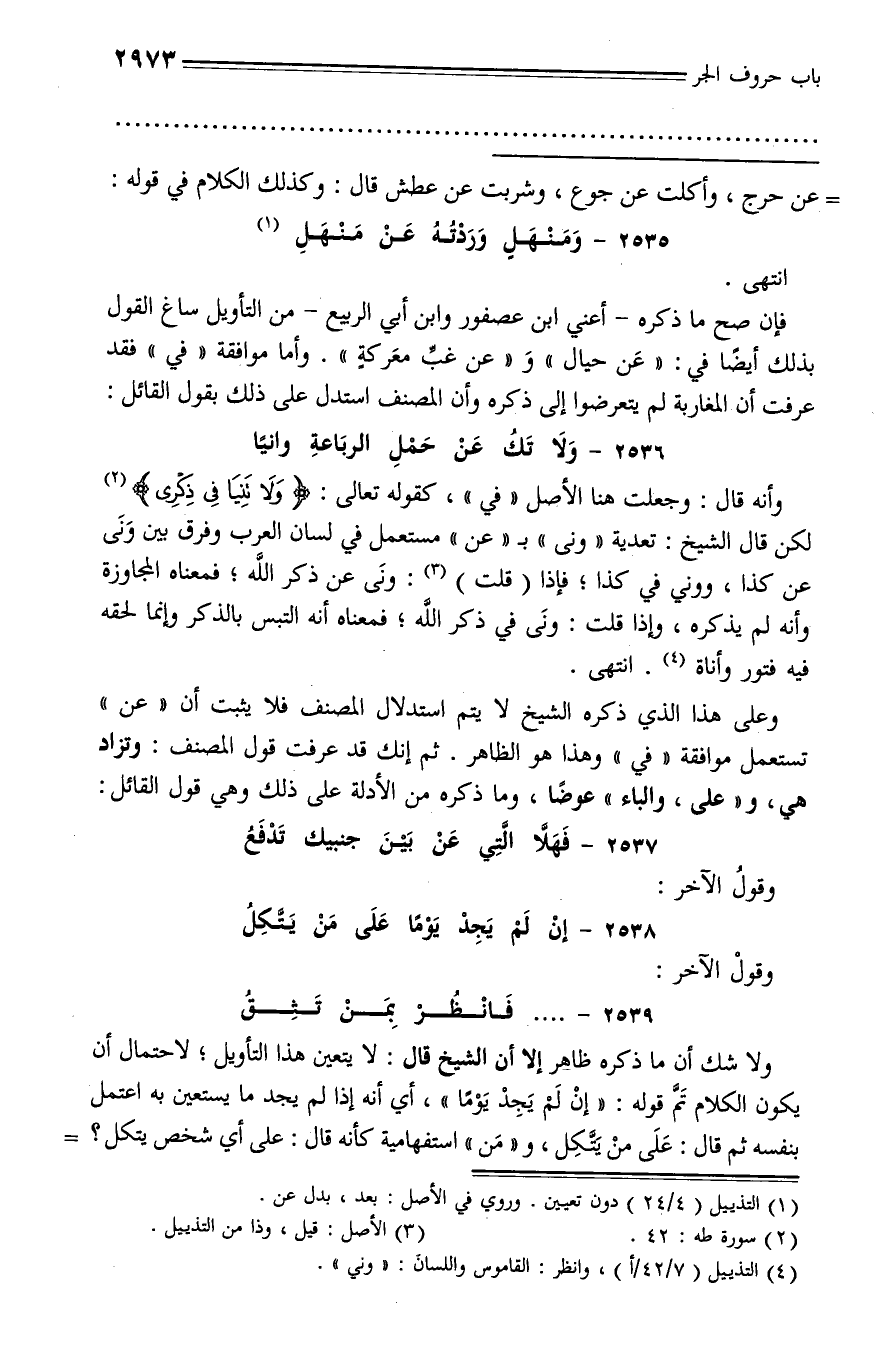 وأنه قال: وجعلت هنا الأصل «في»، كقوله تعالى: وَلا تَنِيا فِي ذِكْرِي (¬2) لكن قال الشيخ: تعدية «ونى» بـ «عن»