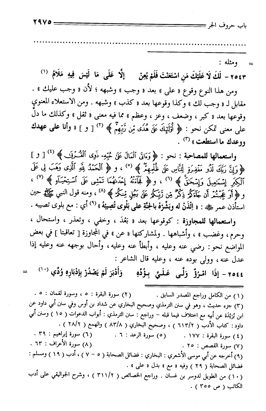 مقابل لـ «وجب لك» وكذا وقوعها بعد «كذب» وشبهه. ومن الاستعلاء المعنوي وقوعها بعد «كبر، وضعف، وعز، وعظم» مما فيه معنى «ثقل» وكذلك ما دلّ على معنى تمكن نحو: أُولئِكَ عَلى هُدىً مِنْ رَبِّهِمْ * (¬2) [و] «وأنا على عهدك ووعدك ما استطعت» (¬3).