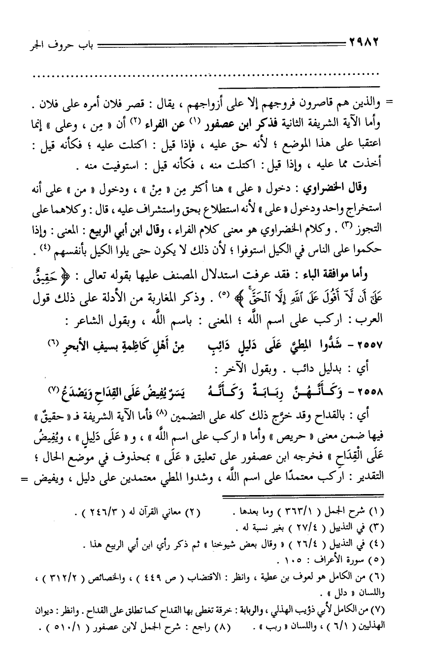أي: بالقداح وقد خرّج ذلك كله على التضمين (¬8) فأما الآية الشريفة فـ «حقيق» فيها ضمن معنى «حريص» وأما «اركب على اسم الله»، و «على دليل»، ويفيض على القداح» فخرجه ابن عصفور على تعليق «على» بمحذوف في موضع الحال؛ التقدير: اركب معتمدا على اسم الله، وشدوا المطي معتمدين على دليل، ويفيض -