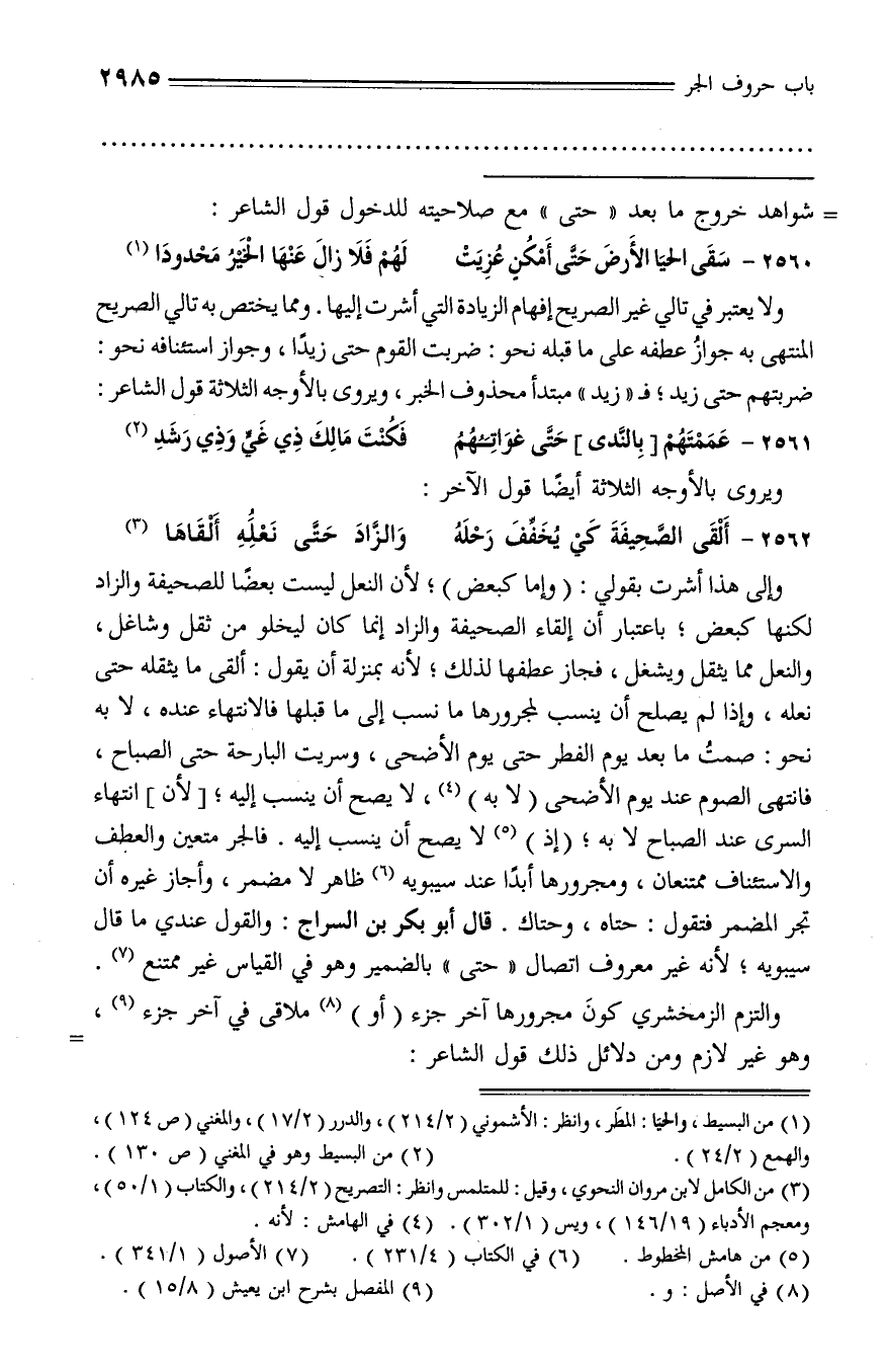 وإلى هذا أشرت بقولي: (وإما كبعض)؛ لأن النعل ليست بعضا للصحيفة والزاد لكنها كبعض؛ باعتبار أن إلقاء الصحيفة والزاد إنما كان ليخلو من ثقل وشاغل، والنعل مما يثقل ويشغل، فجاز عطفها لذلك؛ لأنه بمنزلة أن يقول: ألقى ما يثقله حتى نعله، وإذا لم يصلح أن ينسب لمجرورها ما نسب إلى ما قبلها فالانتهاء عنده، لا به نحو: صمت ما بعد يوم الفطر حتى يوم الأضحى، وسريت البارحة حتى الصباح، فانتهى الصوم عند يوم الأضحى (لا به) (¬4)، لا يصح أن ينسب إليه؛ [لأن] انتهاء السرى عند الصباح لا به؛ (إذ) (¬5) لا يصح أن ينسب إليه. فالجر متعين والعطف والاستئناف ممتنعان، ومجرورها أبدا عند سيبويه (¬6) ظاهر لا مضمر، وأجاز غيره أن تجر المضمر فتقول: حتاه، وحتاك. قال أبو بكر بن السراج: والقول عندي ما قال سيبويه؛ لأنه غير معروف اتصال «حتى» بالضمير وهو في القياس غير ممتنع (¬7).