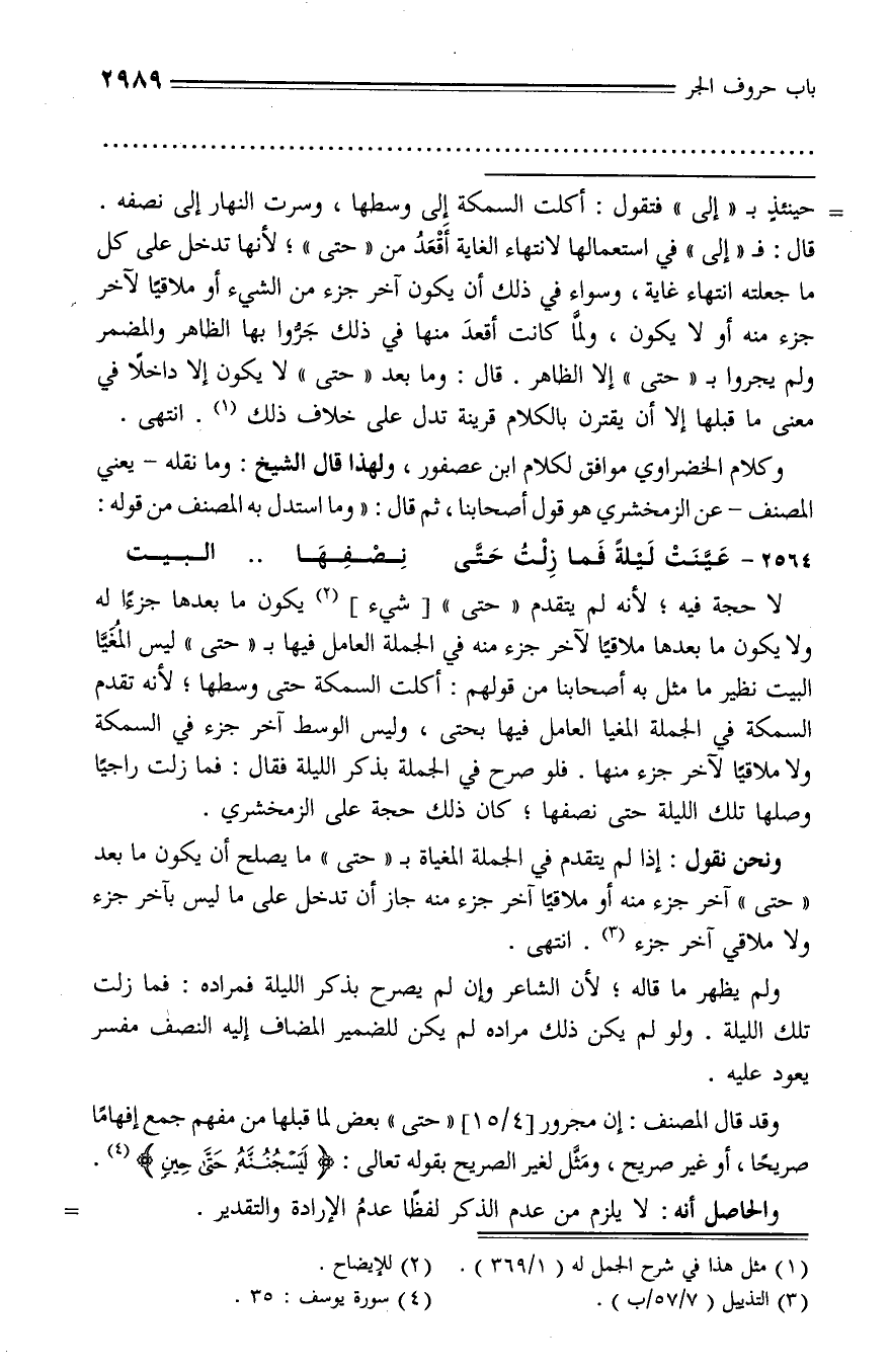 ونحن نقول: إذا لم يتقدم في الجملة المغياة بـ «حتى» ما يصلح أن يكون ما بعد «حتى» آخر جزء منه أو ملاقيا آخر جزء منه جاز أن تدخل على ما ليس بآخر جزء ولا ملاقي آخر جزء (¬3). انتهى.