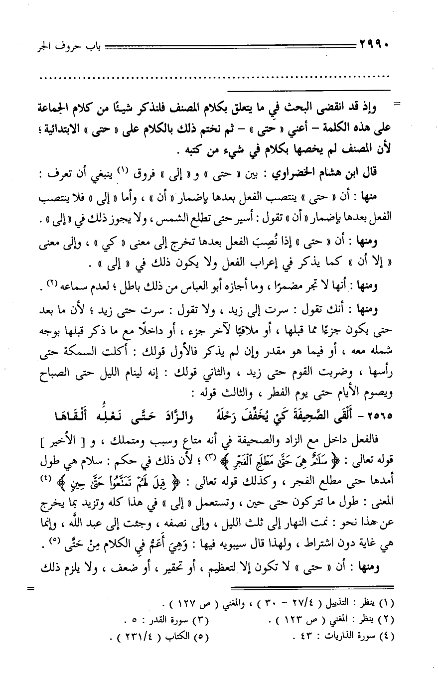 فالفعل داخل مع الزاد والصحيفة في أنه متاع وسبب ومتملك، و [الأخير] قوله تعالى: سَلامٌ هِيَ حَتَّى مَطْلَعِ الْفَجْرِ (¬3)؛ لأن ذلك في حكم: سلام هي طول أمدها حتى مطلع الفجر، وكذلك قوله تعالى: قِيلَ لَهُمْ تَمَتَّعُوا حَتَّى حِينٍ (¬4) المعنى: طول ما تتركون حتى حين، وتستعمل «إلى» في هذا كله وتزيد بما يخرج عن هذا نحو: نمت النهار إلى ثلث الليل، وإلى نصفه، وجئت إلى عبد الله، وإنما هي غاية دون اشتراط، ولهذا قال سيبويه فيها: وهي أعمّ في الكلام من حتّى (¬5).