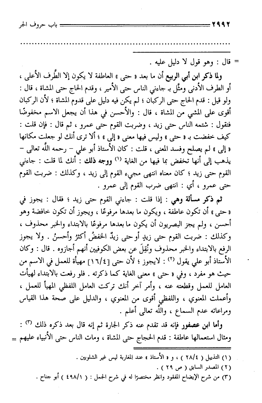 ولما ذكر ابن أبي الربيع أن ما بعد «حتى» العاطفة لا يكون إلا الطّرف الأعلى، أو الطرف الأدنى ومثّل ب جاءني الناس حتى الأمير، وقدم الحاج حتى المشاة، قال: