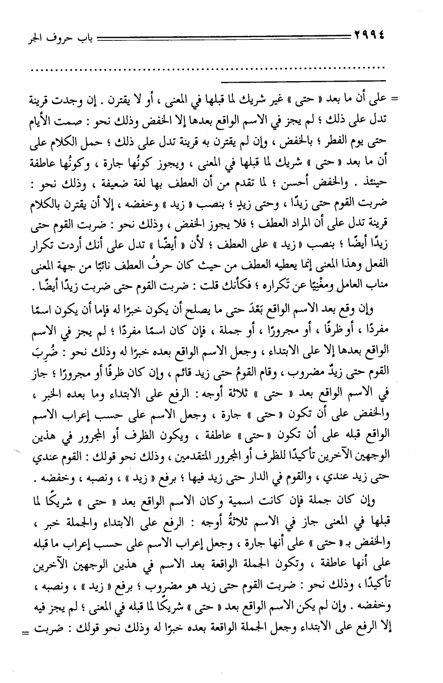 على أن ما بعد «حتى» غير شريك لما قبلها في المعنى، أو لا يقترن. إن وجدت قرينة تدل على ذلك؛ لم يجز في الاسم الواقع بعدها إلا الخفض وذلك نحو: صمت الأيام حتى يوم الفطر؛ بالخفض، وإن لم يقترن به قرينة تدل على ذلك؛ حمل الكلام على أن ما بعد «حتى» شريك لما قبلها في المعنى، ويجوز كونها جارة، وكونها عاطفة حينئذ. والخفض أحسن؛ لما تقدم من أن العطف بها لغة ضعيفة، وذلك نحو: