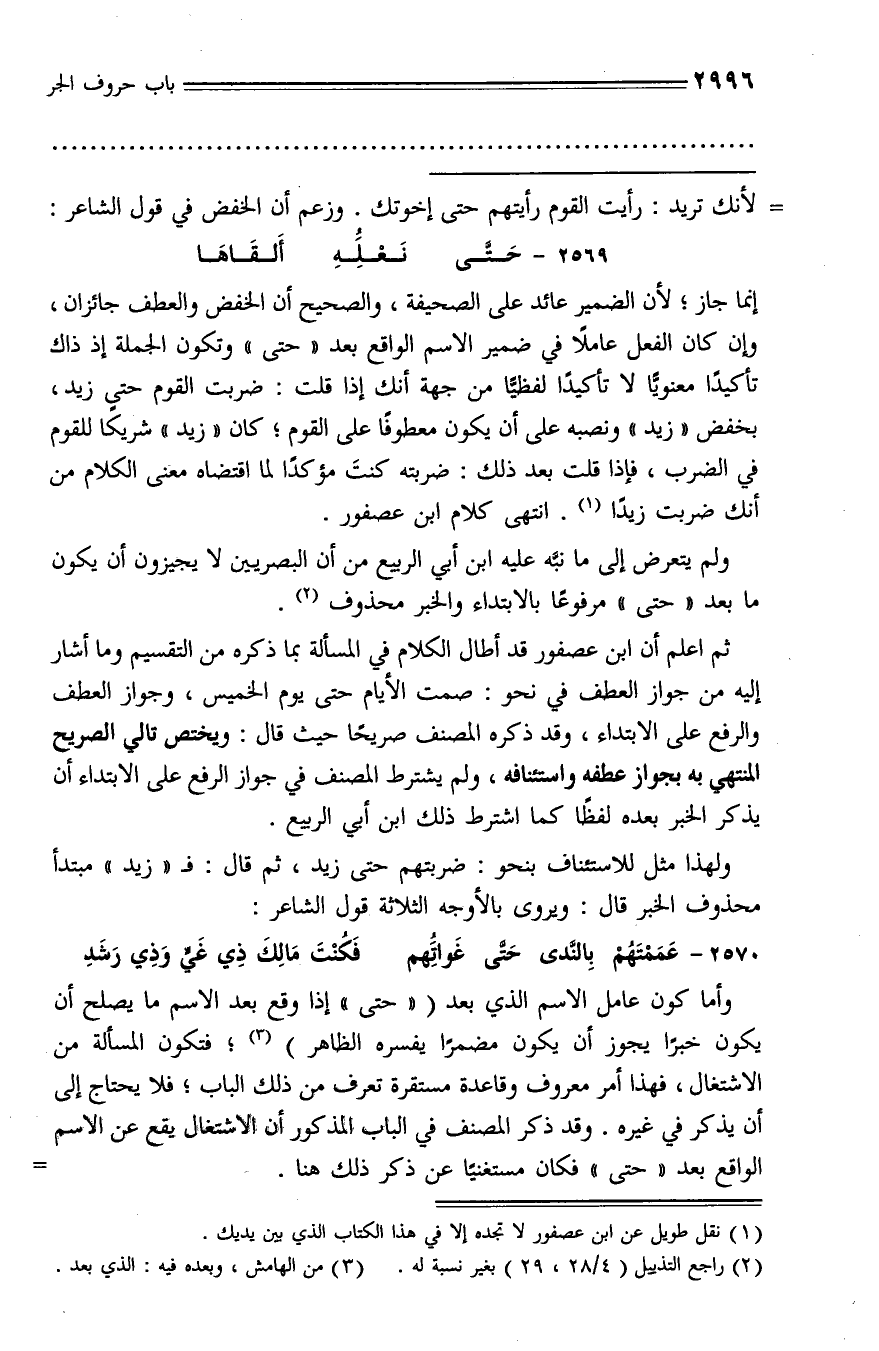 إنما جاز؛ لأن الضمير عائد على الصحيفة، والصحيح أن الخفض والعطف جائزان، وإن كان الفعل عاملا في ضمير الاسم الواقع بعد «حتى» وتكون الجملة إذ ذاك تأكيدا معنويّا لا تأكيدا لفظيّا من جهة أنك إذا قلت: ضربت القوم حتى زيد، بخفض «زيد» ونصبه على أن يكون معطوفا على القوم؛ كان «زيد» شريكا للقوم في الضرب، فإذا قلت بعد ذلك: ضربته كنت مؤكدا لما اقتضاه معنى الكلام من أنك ضربت زيدا (¬1). انتهى كلام ابن عصفور.