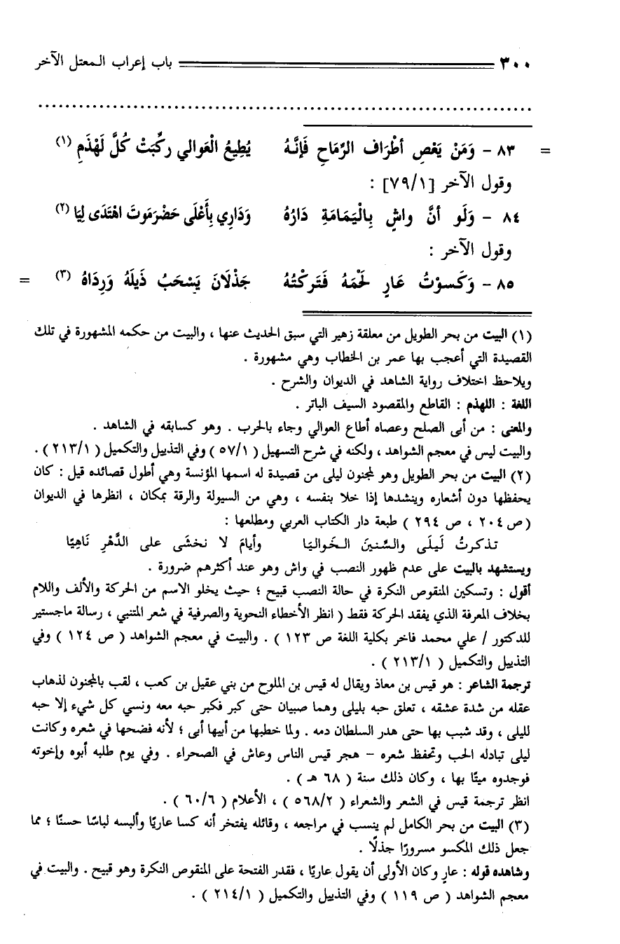 (¬2) البيت من بحر الطويل وهو لمجنون ليلى من قصيدة له اسمها المؤنسة وهي أطول قصائده قيل: كان يحفظها دون أشعاره وينشدها إذا خلا بنفسه، وهي من السيولة والرقة بمكان، انظرها في الديوان (ص 204، ص 294) طبعة دار الكتاب العربي ومطلعها: