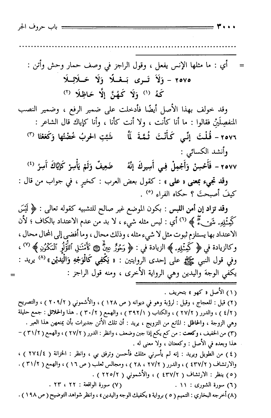 وقد تزاد إن أمن اللبس: بكون الموضع غير صالح للتشبيه كقوله تعالى: لَيْسَ كَمِثْلِهِ شَيْءٌ (¬6) أي: ليس مثله شيء، لا بد من عدم الاعتداد بالكاف؛ لأن الاعتداد بها يستلزم ثبوت مثل لا شيء مثله، وذلك محال، وما أفضى إلى المحال محال، وكالزيادة في (كمثله) الزيادة في: وَحُورٌ عِينٌ (22) كَأَمْثالِ اللُّؤْلُؤِ الْمَكْنُونِ (¬7)، وفي قول النبي صلّى الله عليه وسلّم على إحدى الروايتين: «يكفي كالوجه واليدين» (¬8) يريد: