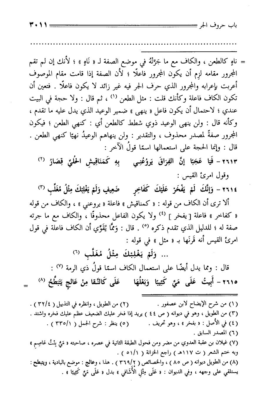 ناه كالطعن، والكاف مع ما جرّته في موضع الصفة لـ «ناه»؛ لأنك إن لم تقم المجرور مقامه لزم أن يكون المجرور فاعلا؛ لأن الصفة إذا قامت مقام الموصوف أعربت بإعرابه والمجرور الذي حرف الجر فيه غير زائد لا يكون فاعلا. فتعين أن تكون الكاف فاعلة وكأنك قلت: مثل الطعن (¬1)، ثم قال: ولا حجة في البيت عندي؛ لاحتمال أن يكون فاعل «ينهى» ضمير الوعيد الذي يدل عليه ما تقدم، وكأنه قال: ولن ينهى الوعيد ذوي شطط كالطعن أي: كنهي الطعن؛ فيكون المجرور صفة لمصدر محذوف، والتقدير: ولن ينهاهم الوعيد نهيا كنهي الطعن.