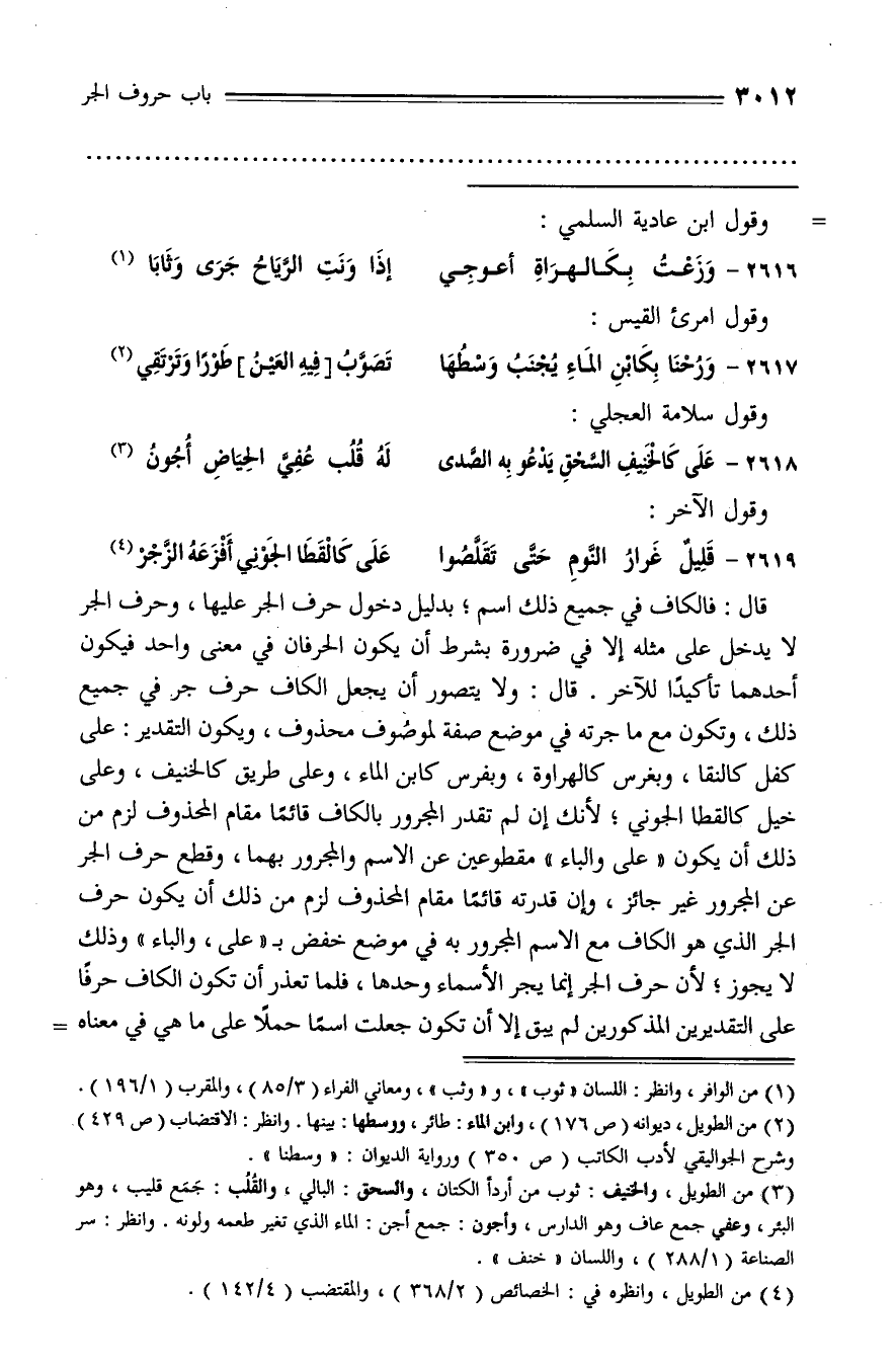 قال: فالكاف في جميع ذلك اسم؛ بدليل دخول حرف الجر عليها، وحرف الجر لا يدخل على مثله إلا في ضرورة بشرط أن يكون الحرفان في معنى واحد فيكون أحدهما تأكيدا للآخر. قال: ولا يتصور أن يجعل الكاف حرف جر في جميع ذلك، وتكون مع ما جرته في موضع صفة لموصوف محذوف، ويكون التقدير: على كفل كالنقا، وبغرس كالهراوة، وبفرس كابن الماء، وعلى طريق كالخنيف، وعلى خيل كالقطا الجوني؛ لأنك إن لم تقدر المجرور بالكاف قائما مقام المحذوف لزم من ذلك أن يكون «على والباء» مقطوعين عن الاسم والمجرور بهما، وقطع حرف الجر عن المجرور غير جائز، وإن قدرته قائما مقام المحذوف لزم من ذلك أن يكون حرف الجر الذي هو الكاف مع الاسم المجرور به في موضع خفض بـ «على، والباء» وذلك لا يجوز؛ لأن حرف الجر إنما يجر الأسماء وحدها، فلما تعذر أن تكون الكاف حرفا على التقديرين المذكورين لم يبق إلا أن تكون جعلت اسما حملا على ما هي في معناه -