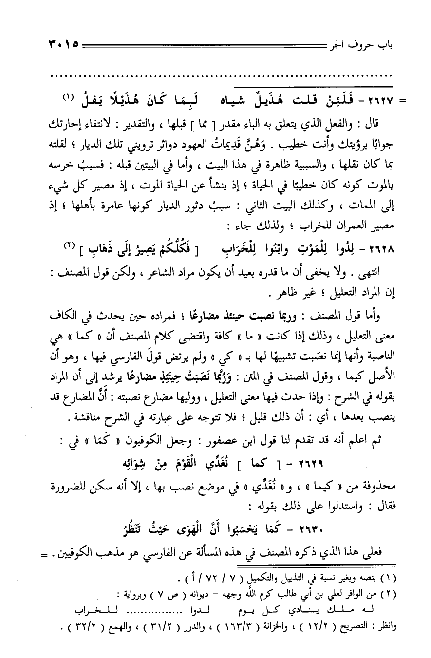 وأما قول المصنف: وربما نصبت حينئذ مضارعا؛ فمراده حين يحدث في الكاف معنى التعليل، وذلك إذا كانت «ما» كافة واقتضى كلام المصنف أن «كما» هي الناصبة وأنها إنما نصبت تشبيها لها بـ «كي» ولم يرتض قول الفارسي فيها، وهو أن الأصل كيما، وقول المصنف في المتن: وربّما نصبت حينئذ مضارعا يرشد إلى أن المراد بقوله في الشرح: وإذا حدث فيها معنى التعليل، ووليها مضارع نصبته: أنّ المضارع قد ينصب بعدها، أي: أن ذلك قليل؛ فلا تتوجه على عبارته في الشرح مناقشة.