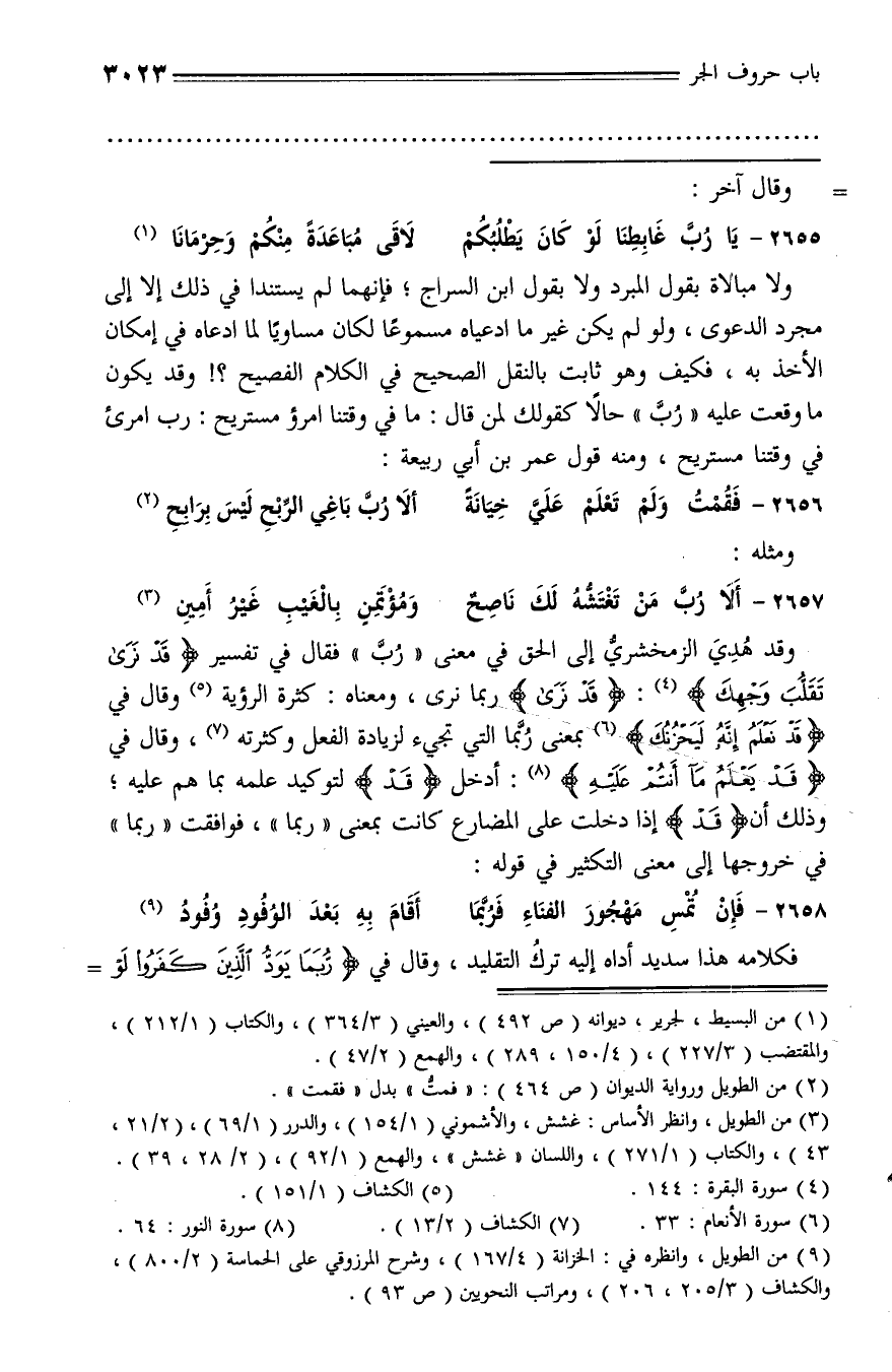 وقد هدي الزمخشريّ إلى الحق في معنى «ربّ» فقال في تفسير قَدْ نَرى تَقَلُّبَ وَجْهِكَ (¬4): قَدْ نَرى ربما نرى، ومعناه: كثرة الرؤية (¬5) وقال في قَدْ نَعْلَمُ إِنَّهُ لَيَحْزُنُكَ (¬6) بمعنى ربّما التي تجيء لزيادة الفعل وكثرته (¬7)، وقال في قَدْ يَعْلَمُ ما أَنْتُمْ عَلَيْهِ (¬8): أدخل (قد) لتوكيد علمه بما هم عليه؛ وذلك أن (قد) إذا دخلت على المضارع كانت بمعنى «ربما»، فوافقت «ربما» في خروجها إلى معنى التكثير في قوله: