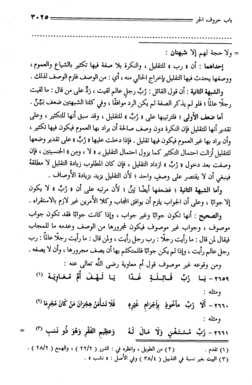 والشبهة الثانية: أن قول القائل: ربّ رجل عالم لقيت، ردّ على من قال: ما لقيت رجلا عالما؛ فلو لم يذكر الصفة لم يكن الرد موافقا، وفي كلتا الشبهتين ضعف بيّن.