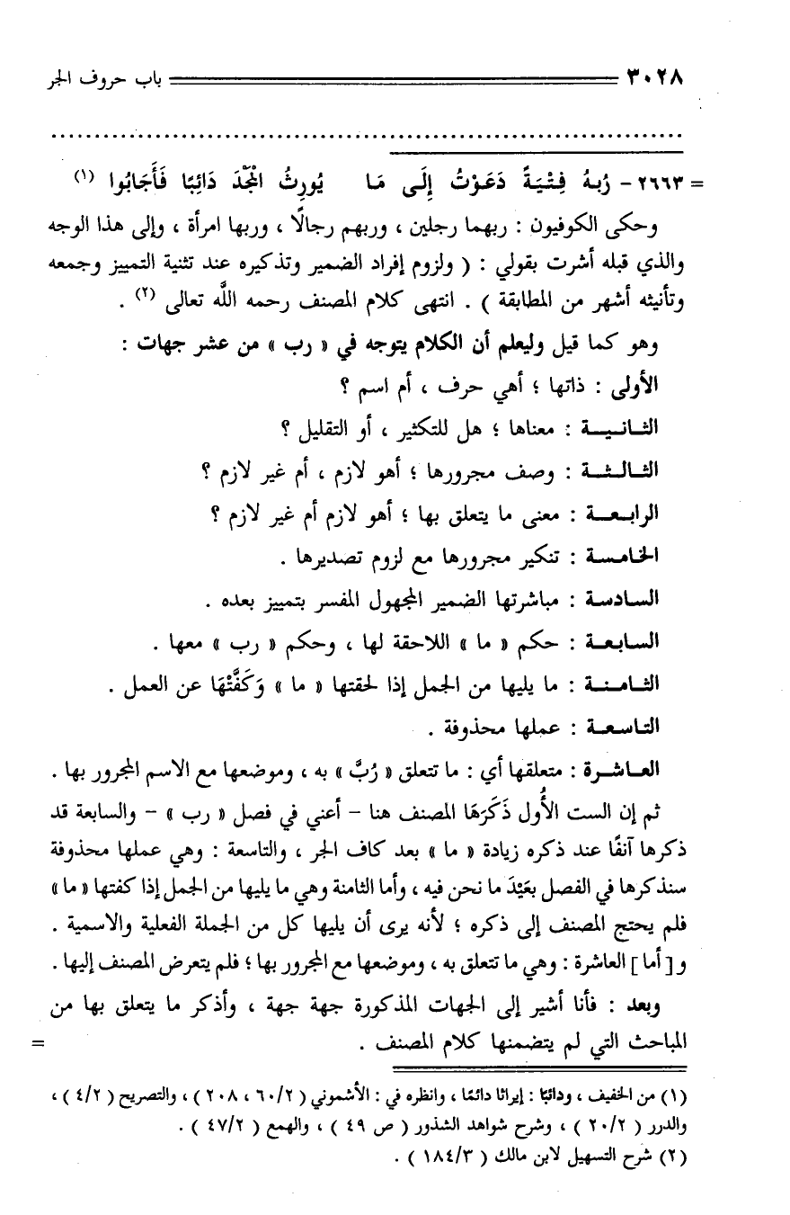ثم إن الست الأول ذكرها المصنف هنا - أعني في فصل «رب» - والسابعة قد ذكرها آنفا عند ذكره زيادة «ما» بعد كاف الجر، والتاسعة: وهي عملها محذوفة سنذكرها في الفصل بعيد ما نحن فيه، وأما الثامنة وهي ما يليها من الجمل إذا كفتها «ما» فلم يحتج المصنف إلى ذكره؛ لأنه يرى أن يليها كل من الجملة الفعلية والاسمية.