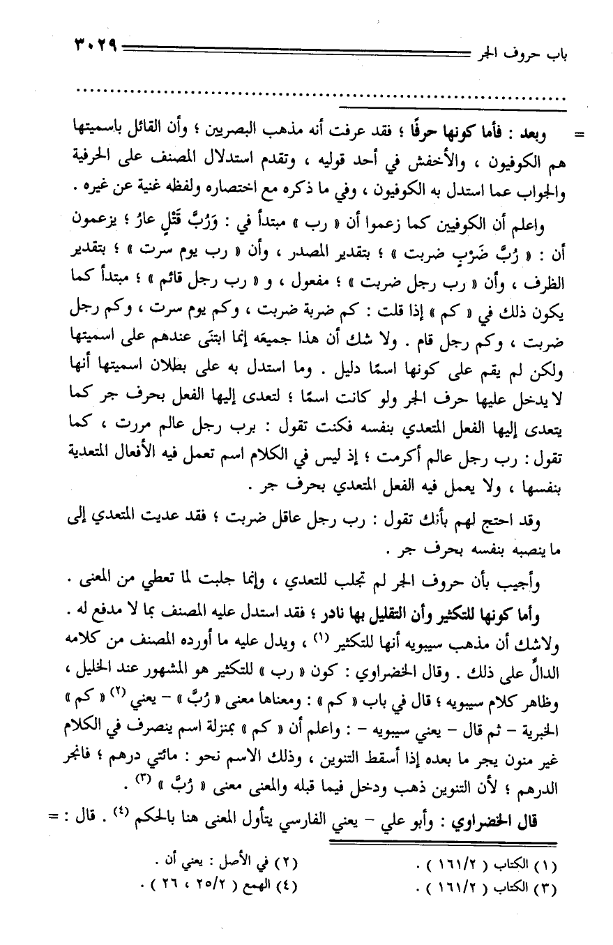واعلم أن الكوفيين كما زعموا أن «رب» مبتدأ في: وربّ قتل عار؛ يزعمون أن: «ربّ ضرب ضربت»؛ بتقدير المصدر، وأن «رب يوم سرت»؛ بتقدير الظرف، وأن «رب رجل ضربت»؛ مفعول، و «رب رجل قائم»؛ مبتدأ كما يكون ذلك في «كم» إذا قلت: كم ضربة ضربت، وكم يوم سرت، وكم رجل ضربت، وكم رجل قام. ولا شك أن هذا جميعه إنما ابتنى عندهم على اسميتها ولكن لم يقم على كونها اسما دليل. وما استدل به على بطلان اسميتها أنها لا يدخل عليها حرف الجر ولو كانت اسما؛ لتعدى إليها الفعل بحرف جر كما يتعدى إليها الفعل المتعدي بنفسه فكنت تقول: برب رجل عالم مررت، كما تقول: رب رجل عالم أكرمت؛ إذ ليس في الكلام اسم تعمل فيه الأفعال المتعدية