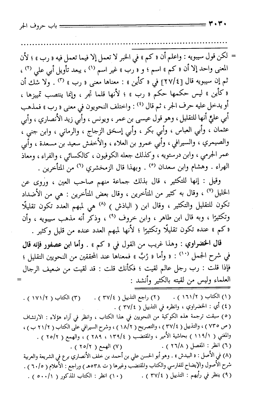 لكن قول سيبويه: واعلم أن «كم» في الخبر لا تعمل إلا فيما تعمل فيه «رب»؛ لأن المعنى واحد إلا أن «كم» اسم؛ و «رب» غير اسم (¬1)، يبعد تأويل أبي علي (¬2)، ثم إن سيبويه قال [4/ 27] في «كأين»: معناها معنى «رب» (¬3). ولا شك أن «كأين» ليس حكمها حكم «رب»؛ لأنها قلما تجر، وإنما ينتصب تمييزها، أو يدخل عليه حرف الجر، ثم قال (¬4): واختلف النحويون في معنى «رب» فمذهب أبي عليّ أنها للتقليل، وهو قول عيسى بن عمر، ويونس، وأبي زيد الأنصاري، وأبي عثمان، وأبي العباس، وأبي بكر، وأبي إسحق الزجاج، والرماني، وابن جني، والصيمري، والسيرافي، وأبي عمرو بن العلاء، والأخفش سعيد بن مسعدة، وأبي عمر الجرمي، وابن درستويه، وكذلك جعله الكوفيون، كالكسائي، والفراء، ومعاذ الهراء. وهشام وابن سعدان (¬5). وبهذا قال الزمخشري (¬6) من المتأخرين.