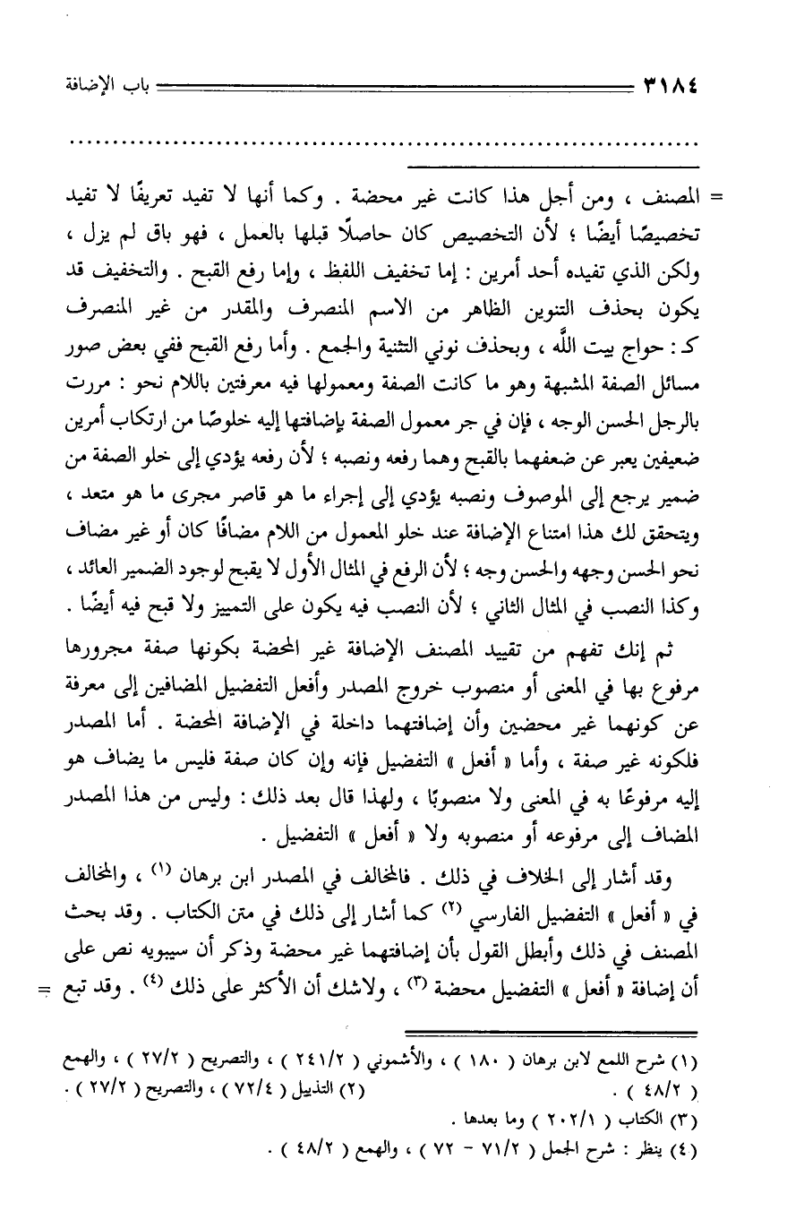 وقد أشار إلى الخلاف في ذلك. فالمخالف في المصدر ابن برهان (¬1)، والمخالف في «أفعل» التفضيل الفارسي (¬2) كما أشار إلى ذلك في متن الكتاب. وقد بحث المصنف في ذلك وأبطل القول بأن إضافتهما غير محضة وذكر