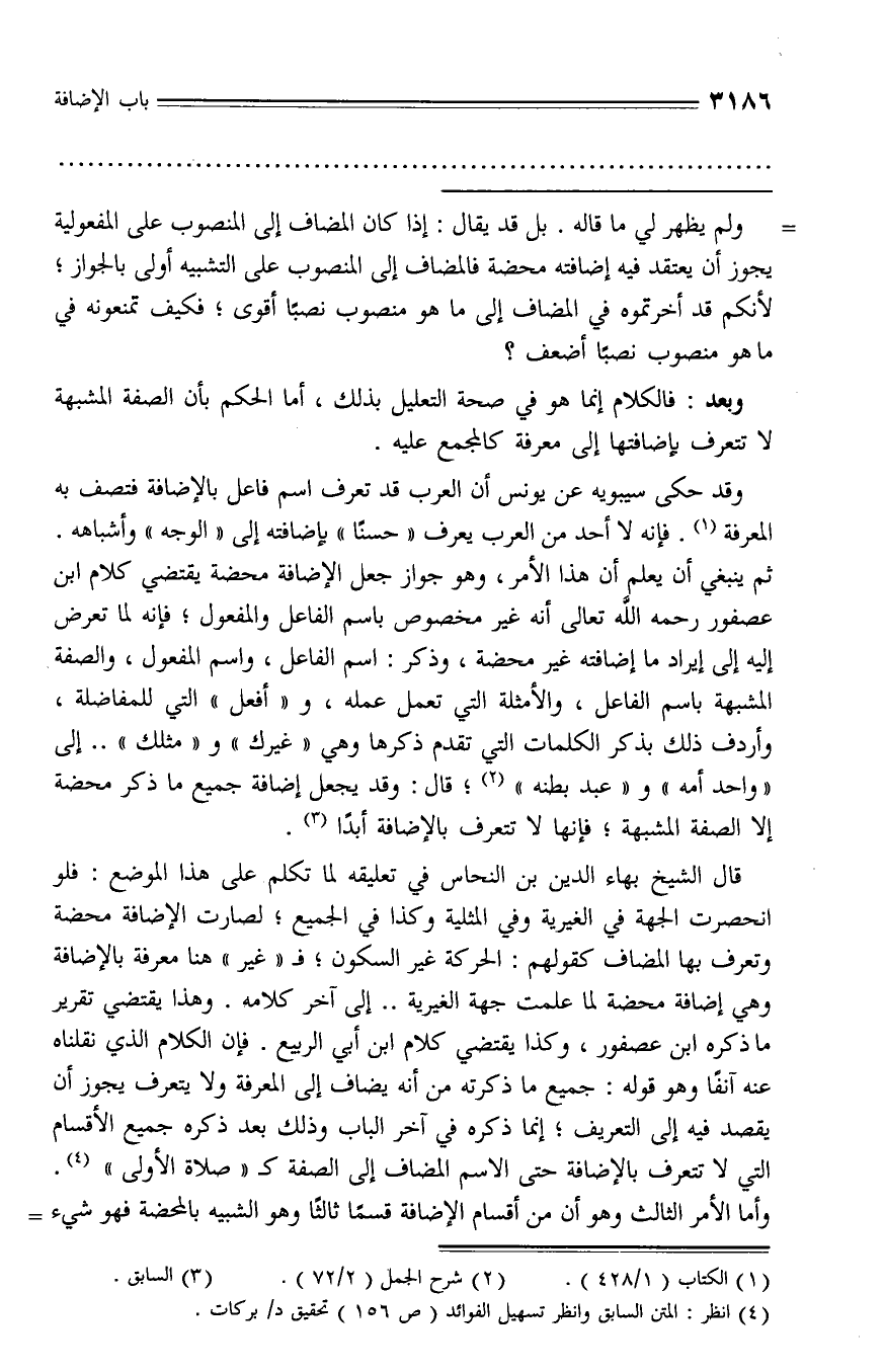 ولم يظهر لي ما قاله. بل قد يقال: إذا كان المضاف إلى المنصوب على المفعولية يجوز أن يعتقد فيه إضافته محضة فالمضاف إلى المنصوب على التشبيه أولى بالجواز؛ لأنكم قد أخرتموه في المضاف إلى ما هو منصوب نصبا أقوى؛ فكيف تمنعونه في ما هو منصوب نصبا أضعف؟