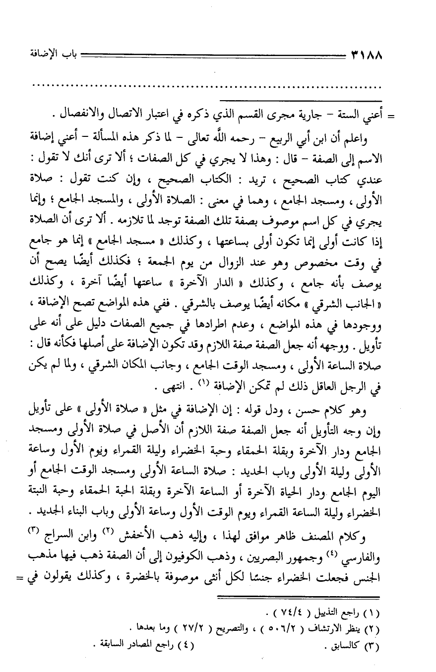 وهو كلام حسن، ودل قوله: إن الإضافة في مثل «صلاة الأولى» على تأويل وإن وجه التأويل أنه جعل الصفة صفة اللازم أن الأصل في صلاة الأولى ومسجد الجامع ودار الآخرة وبقلة الحمقاء وحبة الخضراء وليلة القمراء ويوم الأول وساعة الأولى وليلة الأولى وباب الحديد: صلاة الساعة الأولى ومسجد الوقت الجامع أو اليوم الجامع ودار الحياة الآخرة أو الساعة الآخرة وبقلة الحبة الحمقاء وحبة النبتة الخضراء وليلة الساعة القمراء ويوم الوقت الأول وساعة الأولى وباب البناء الجديد.