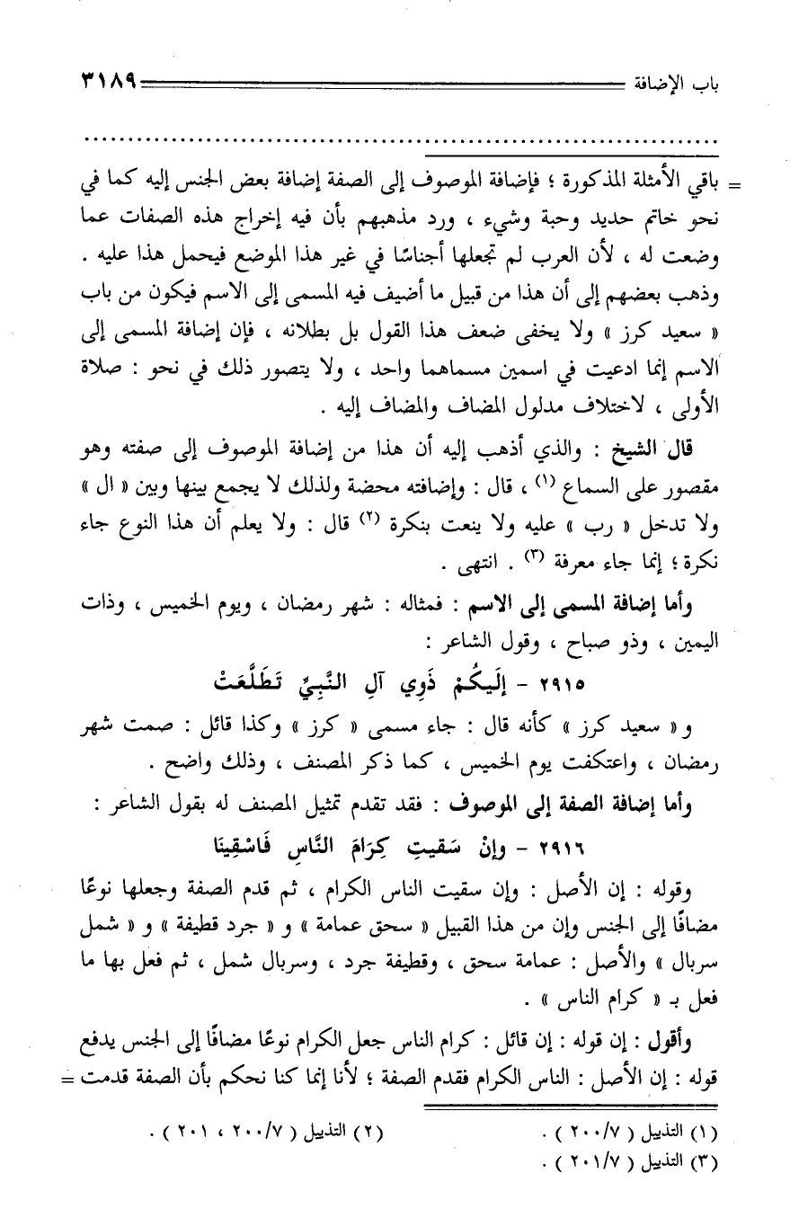 وقوله: إن الأصل: وإن سقيت الناس الكرام، ثم قدم الصفة وجعلها نوعا مضافا إلى الجنس وإن من هذا القبيل «سحق عمامة» و «جرد قطيفة» و «شمل سربال» والأصل: عمامة سحق، وقطيفة جرد، وسربال شمل، ثم فعل بها ما فعل بـ «كرام الناس».